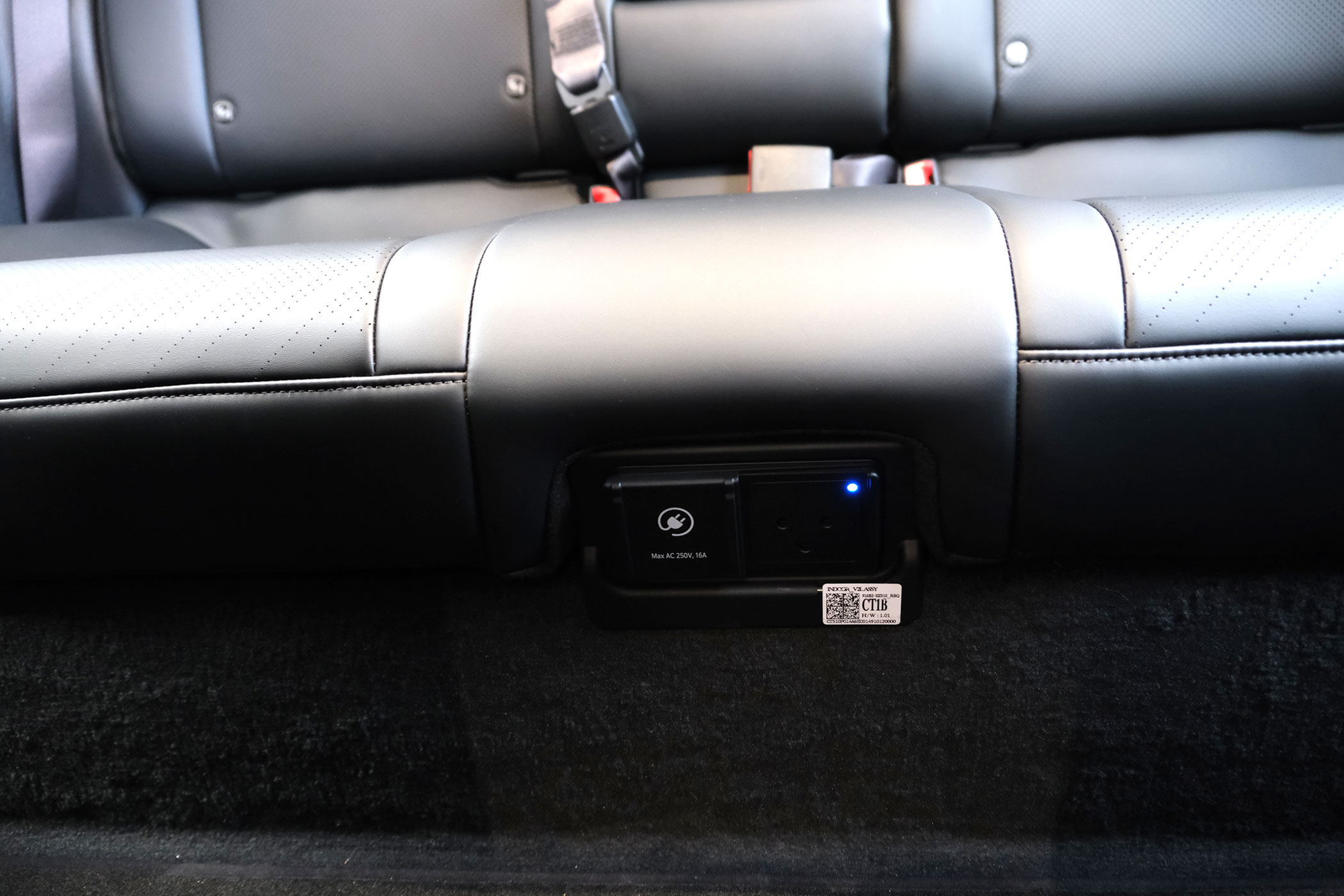 Értékes funkció a fedélzeti konnektor. A Kia EV4-ben a hátsó üléspad közepén lakik a 230 voltos csatlakozó. Fedele abszolút praktikus, mert az útban lévő, felhajtható takarókkal szemben ezt oldalra kell csúsztatni, ami ugyanolyan figyelmességről és átgondoltságról tanúskodik, mint a töltő illetve a töltési+adatátviteli funkciók közötti váltási ehetőség az első USB-C-s aljzatban vagy a kiugróan kényelmes hálós fejtámla.
