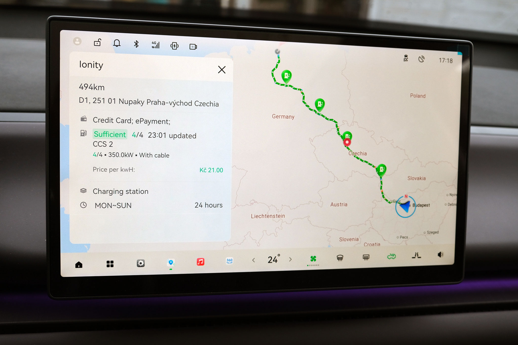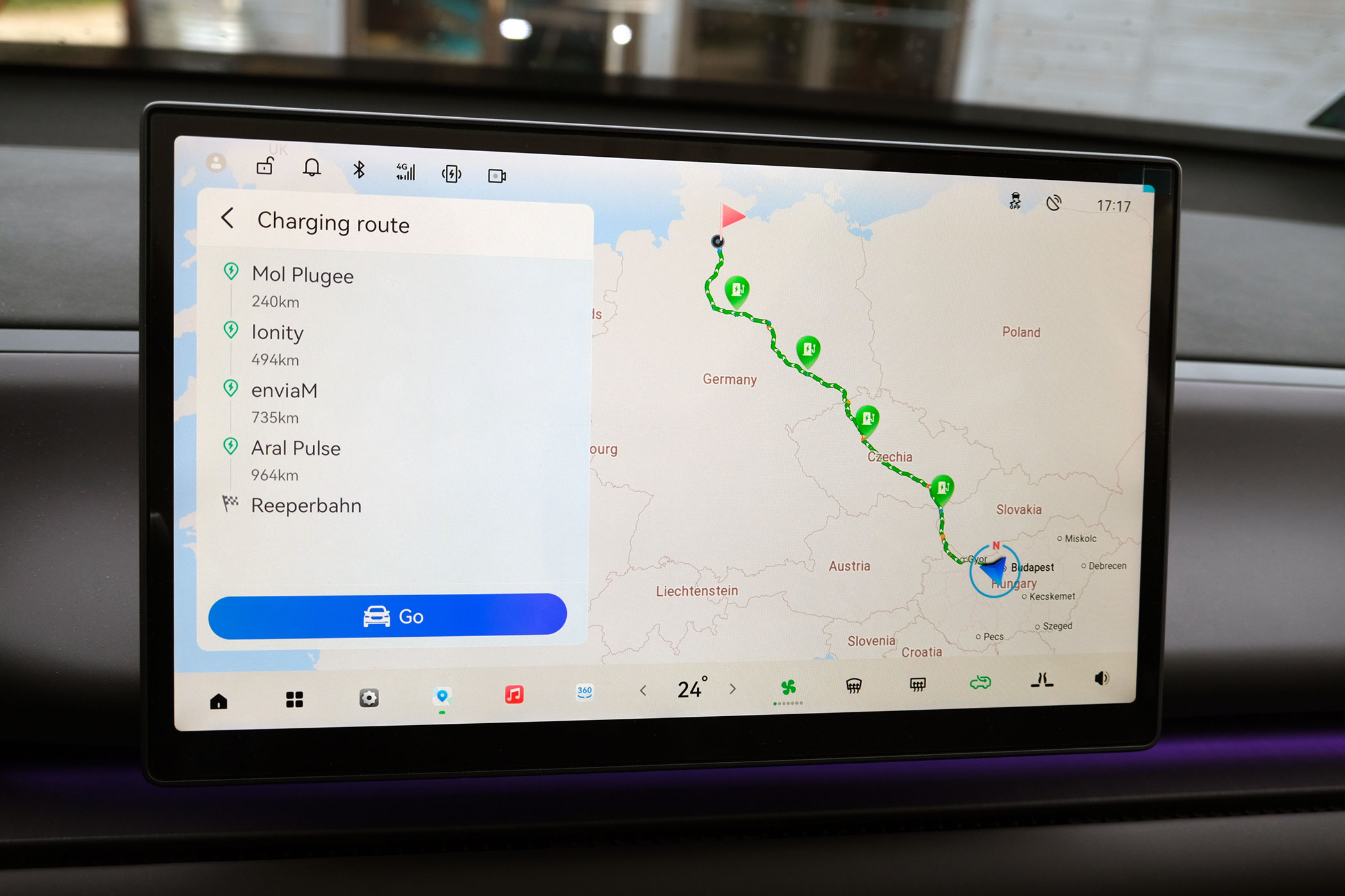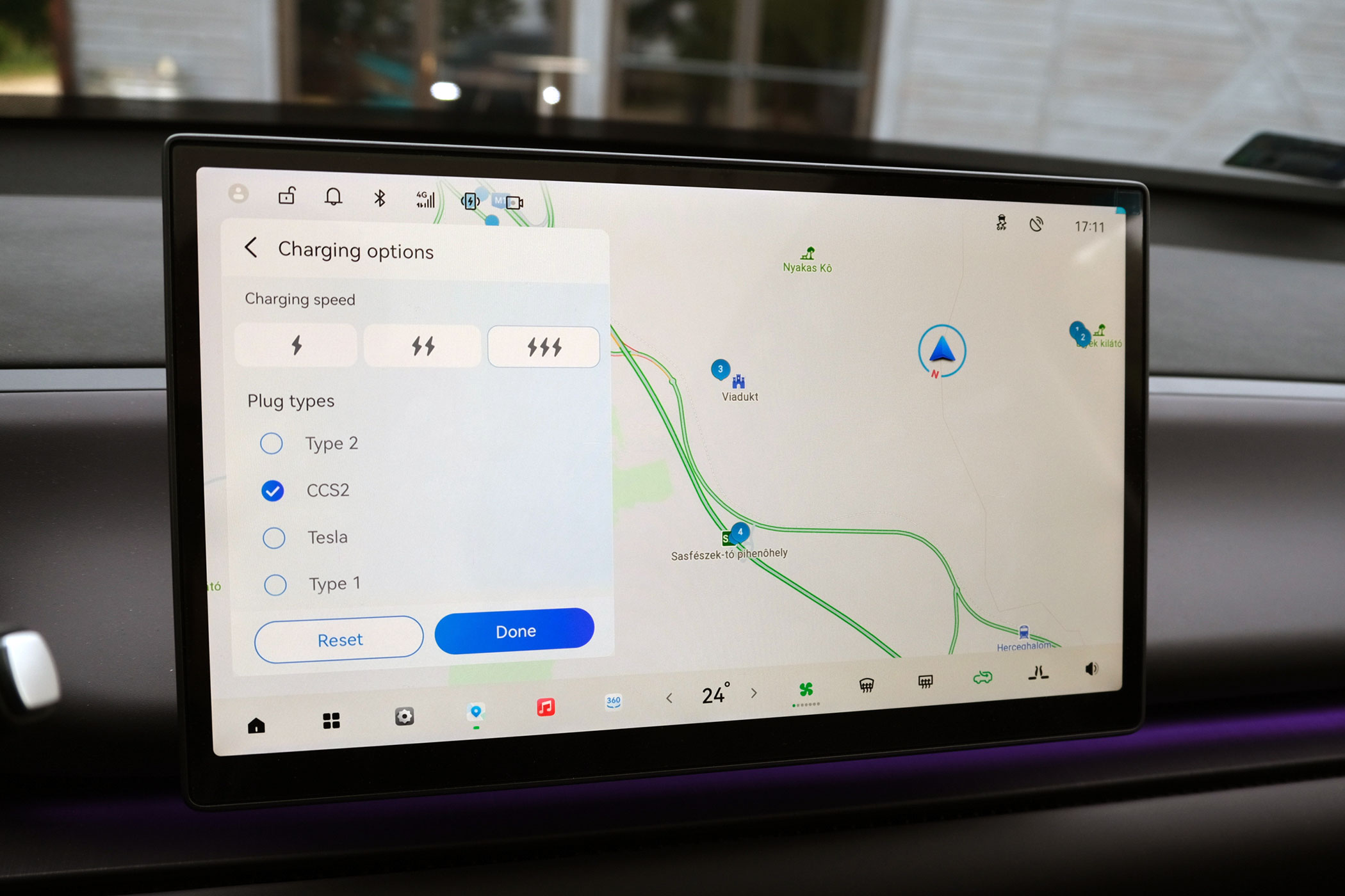 Szokatlanul esendő a távolságtartó tempomat, amely Tesla-stílusban, az irányváltó kar kétszeri lehúzásával aktiválható, a sávtartó, önvezető funkciókkal együtt. Az autó bizonytalan a sávok azonosításában, ennek jeleként az M0-s kanyarjaiban a külső sávban kapaszkodó teherautók miatt kicsit befékez, aztán gyorsít, aztán fékez, gyorsít. De legalább az utoljára leolvasott sebességhatár túllépésekor érkező hangjelzés gyorsan elcsendesíthető az érintőképernyő gyorsmenüjéből.