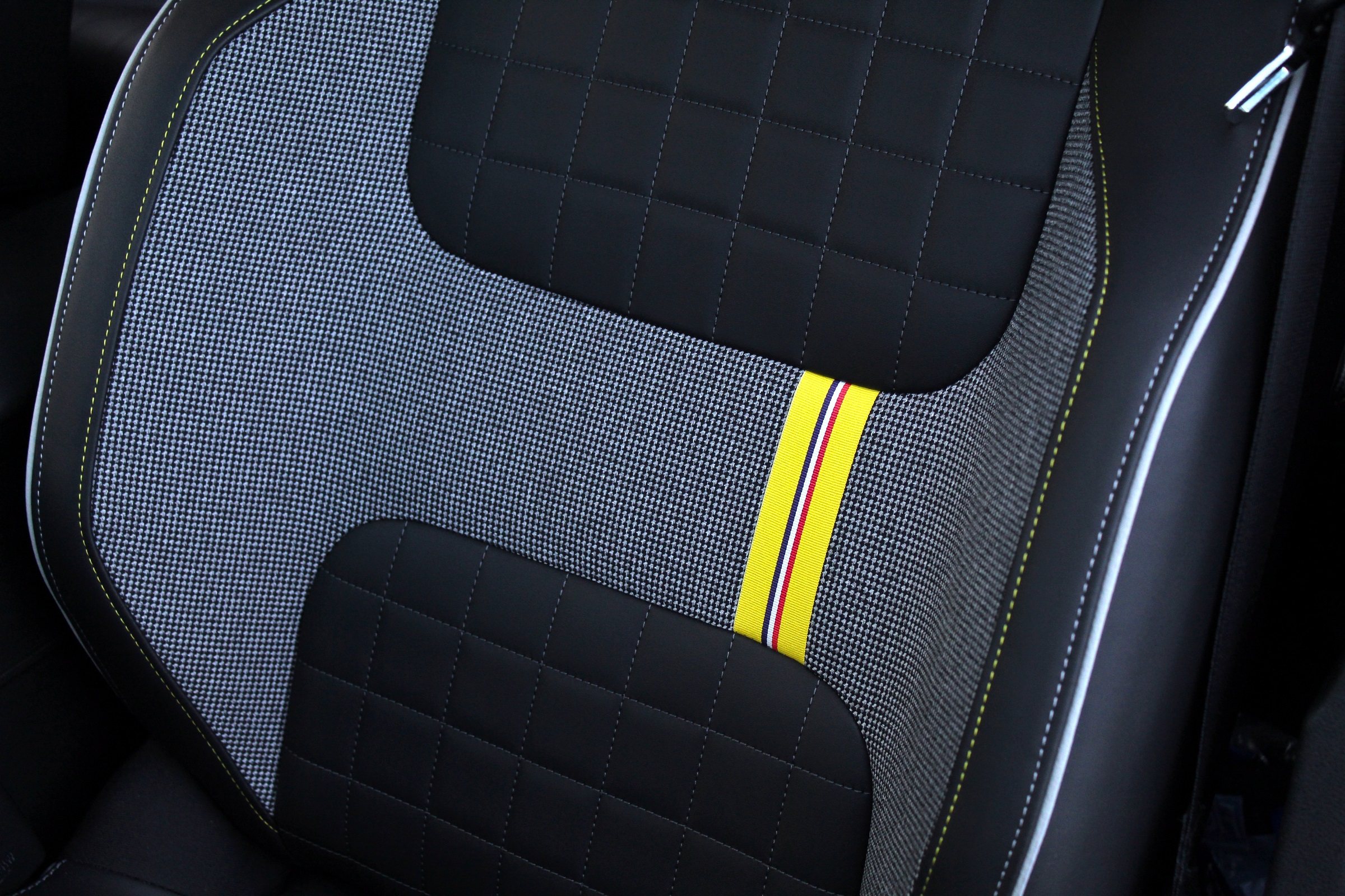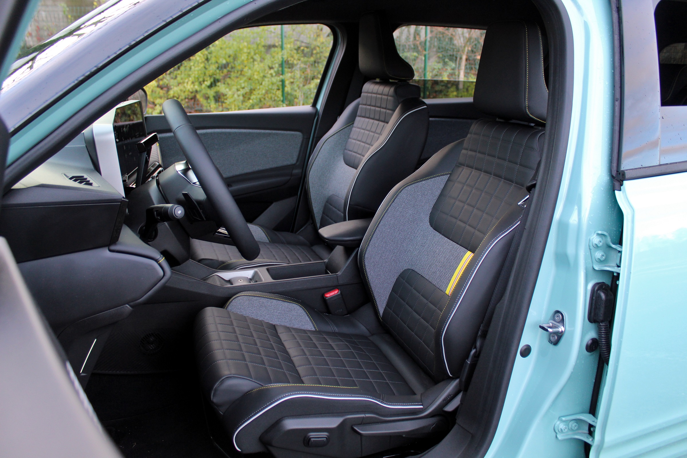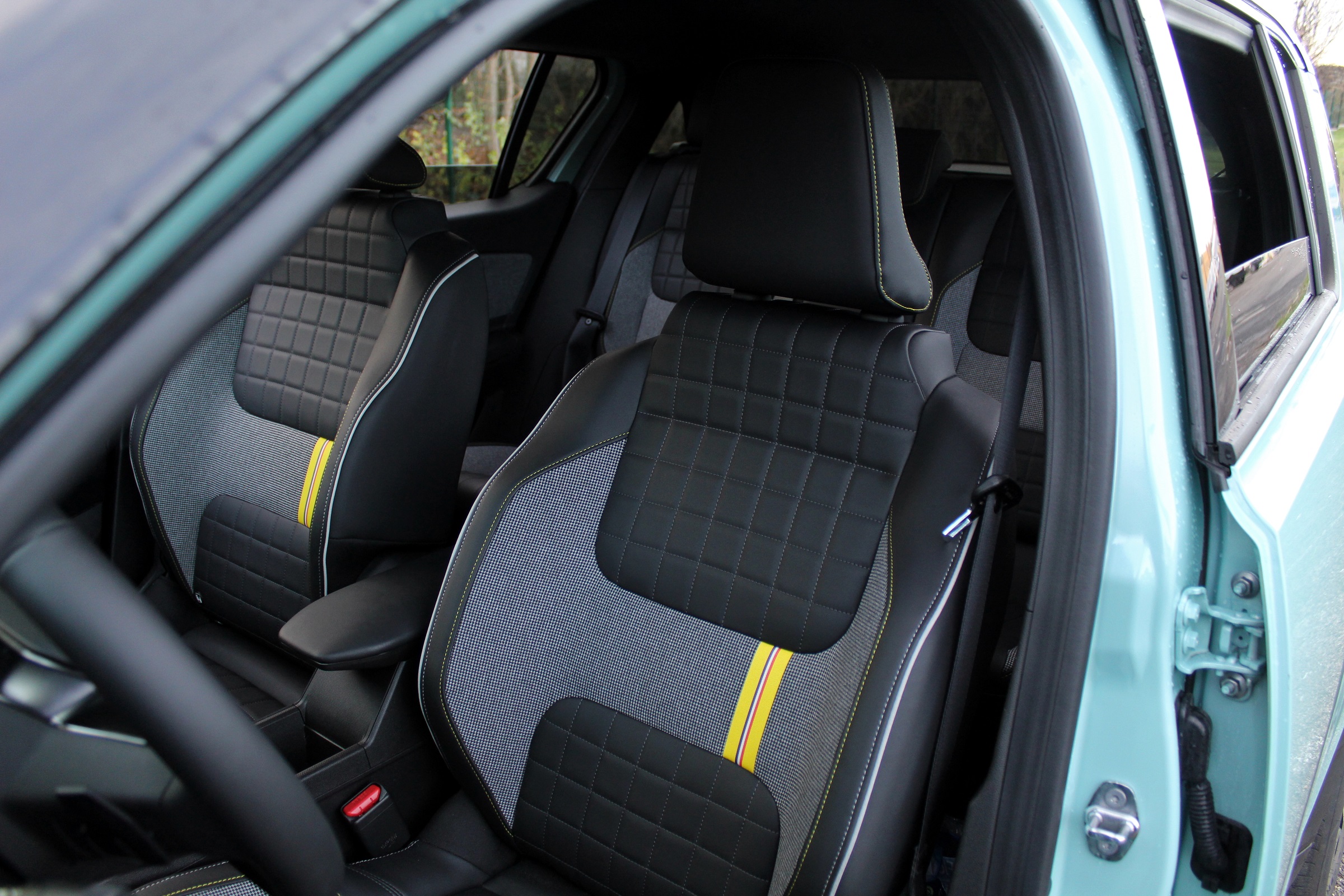 Élettel teli belső teret látunk magunk előtt ajtónyitás után, mindenhol színekkel és mintákkal. A mindenholt tényleg szó szerint kell érteni, még a tetőkárpit sem sima felületű. Mintha divattervezők alkották volna a belsőt: tyúklábmintás ülésbetét sárga kiegészítőkkel, négyzetminták, és még a francia trikolór is megjelenik. A kárpitozás 100 százalékban újrahasznosított, de a minőségen ez nem érződik. Egyszerre nosztalgikus és modern, utóbbiról a digitális megoldások gondoskodnak.