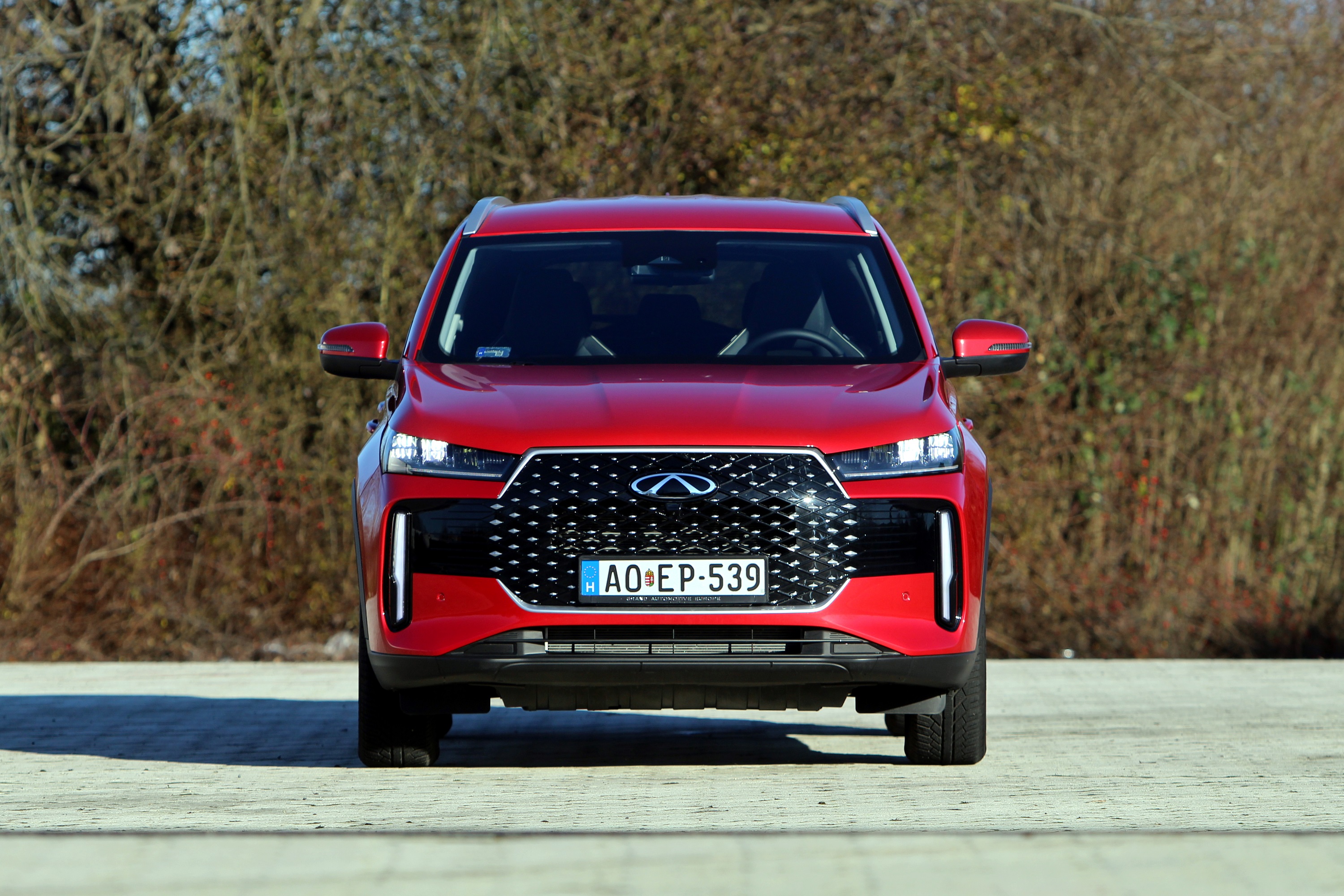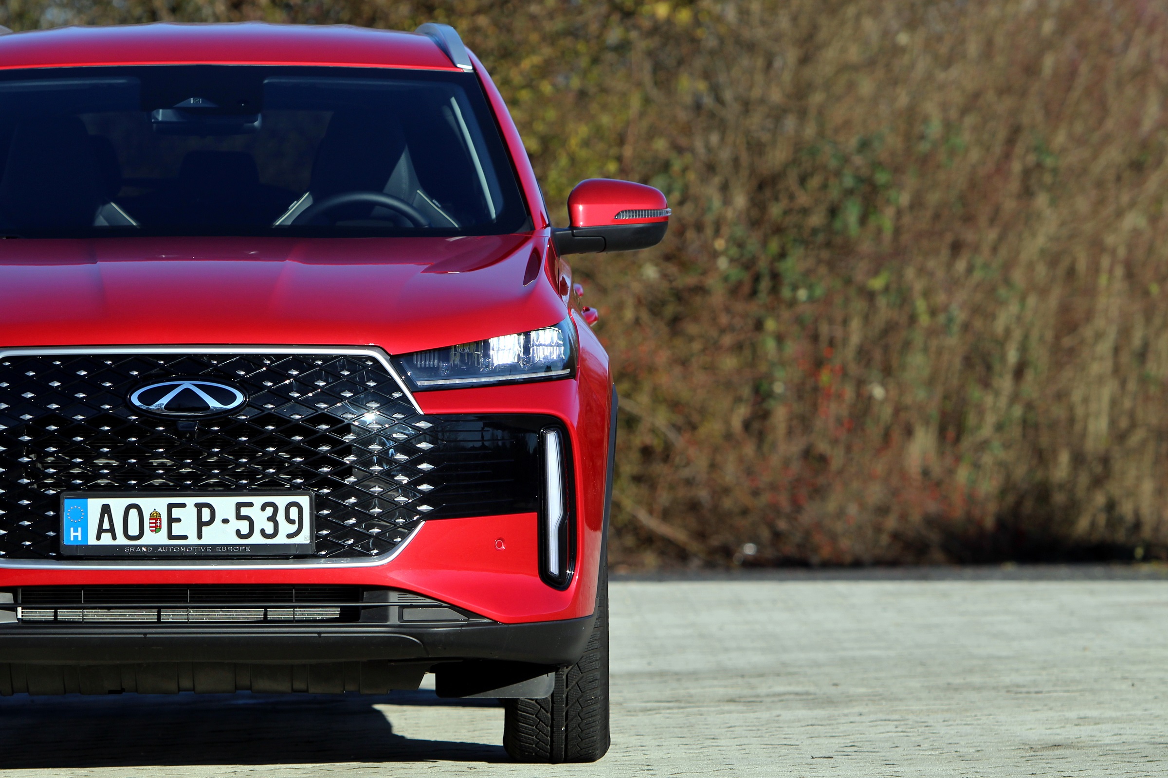 A hatalmasra nőtt hűtőmaszk mostanság is népszerű, azonban a Chery itt nem élt azzal a sokak által már alkalmazott trükkel, hogy a fényszórók valamiféle egységet alkossanak az arcot leginkább meghatározó részekkel. Minden Magyarországon kapható Chery modell ilyen egyébként, a nagy maszkban lévő sok apró pötty határozza meg a megjelenést. Jelen esetben ezek a pöttyök krómozott rombuszok. Nincs mindenhol köztük kivágás, a levegő csak a rendszám feletti, vagy az egyébként is látható rendszám alatti részen áramlik.