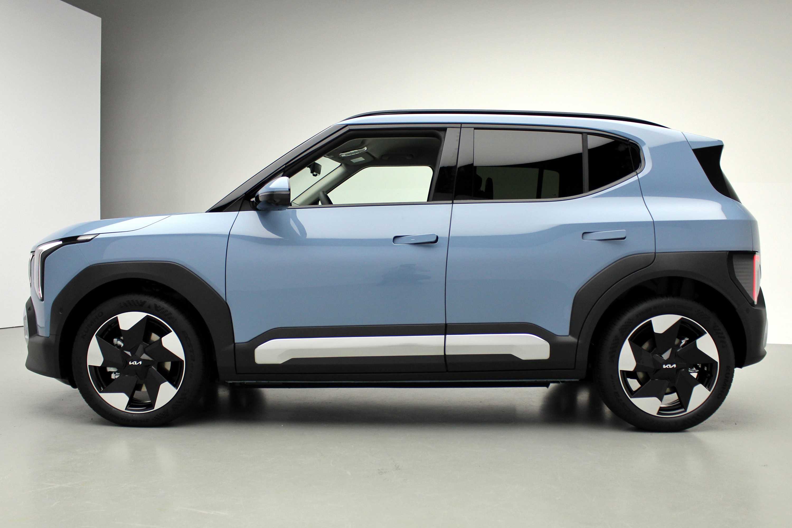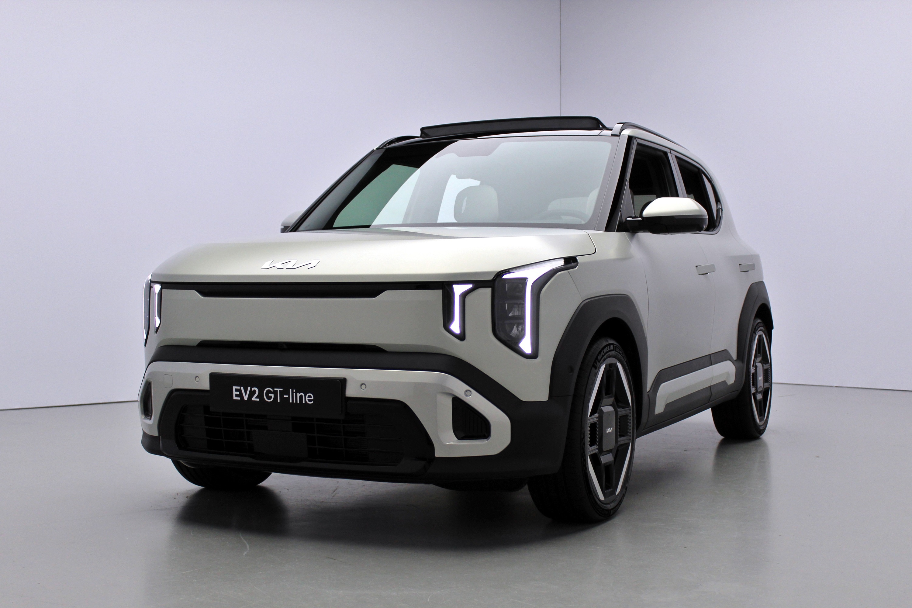 Ebből a tervezési filozófiából nem csupán mutatós autó született, hanem egy kicsit megtévesztő is. Képek alapján megmondhatatlan, hogy a Kia EV2 csupán 4060 mm hosszú, 1800 mm széles és 1575 mm magas. A márka jelenlegi kínálatában csak a Picanto kisebb ennél a maga 3,6 méterével. Az optikai trükközést segítik a fekete lökhárítók és a hangsúlyos kerékjárat környéki elemek, de a különböző méretű felnik is befolyásolhatják. A kínálat 16 és 19 col között mozog, a legnagyobbak a GT-Line variánsnál érhetőek el – ennél a kivitelnél más a lökhárítóbetétek formája is.