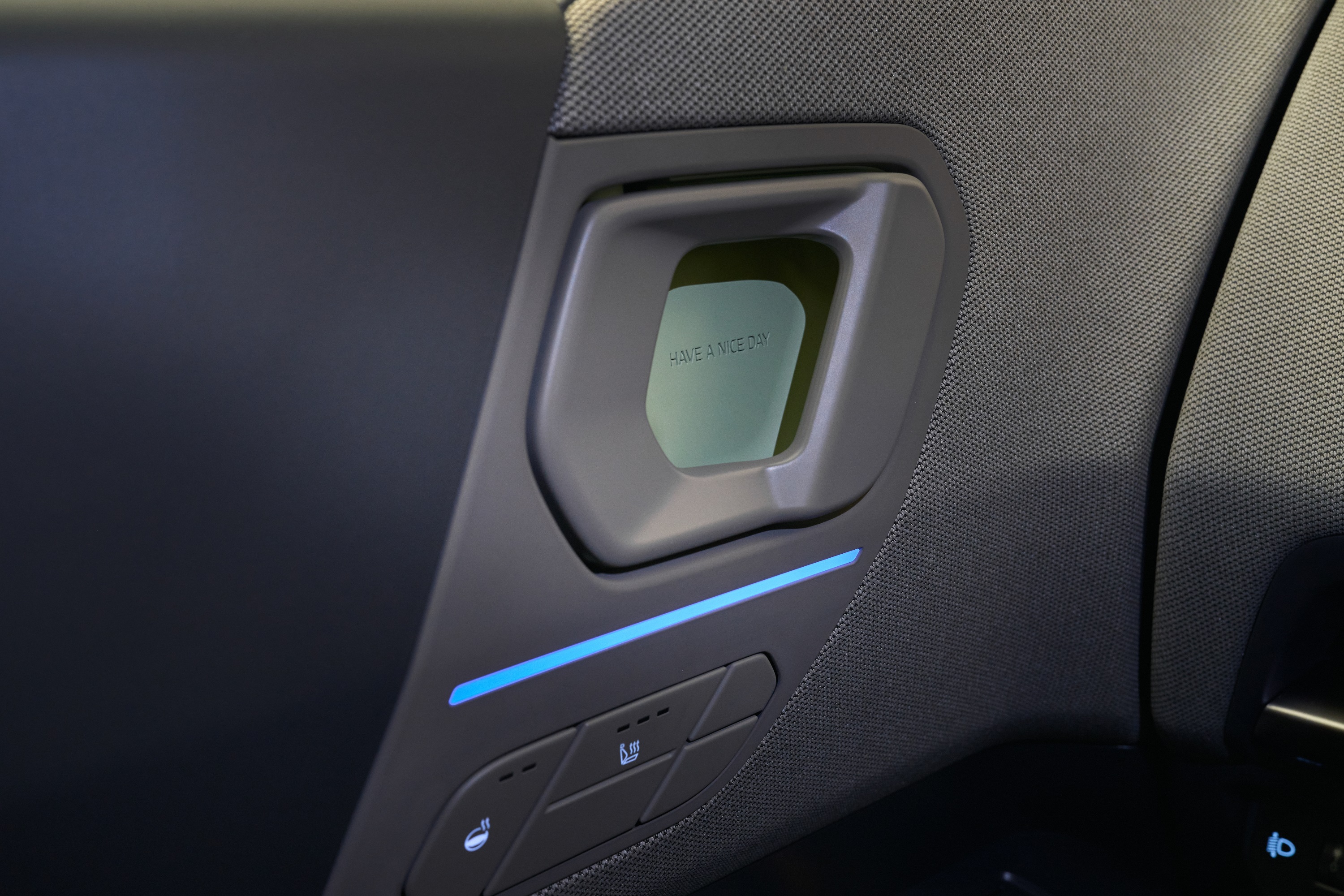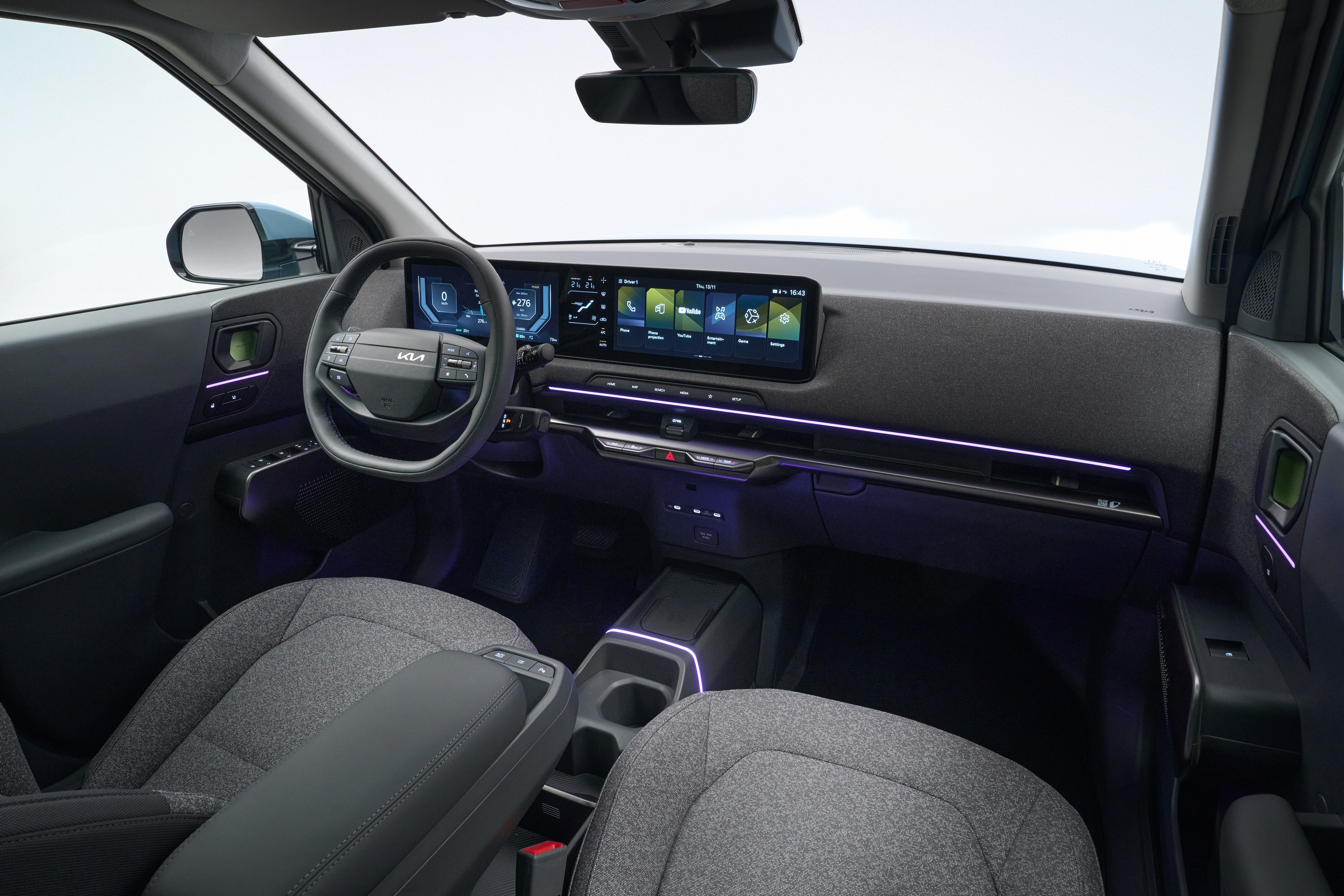 Beszállás előtt kedves üdvözlőfeliratot pillanthatunk meg az ablak mögött, az autó elhagyásakor pedig minden alkalommal a szép napot angol verzióját olvashatjuk a kilincseknél. Kellemes érzéseket kelt ez az utazóban, de ez is volt a célja a Kiának az EV2 belterének megalkotásakor. Itt a piknikkosár nevű koncepcióval találkozhatunk, ami a logikusnak vélt berendezéssel és főként a szövetek használatával próbál kellemes környezetet teremteni.