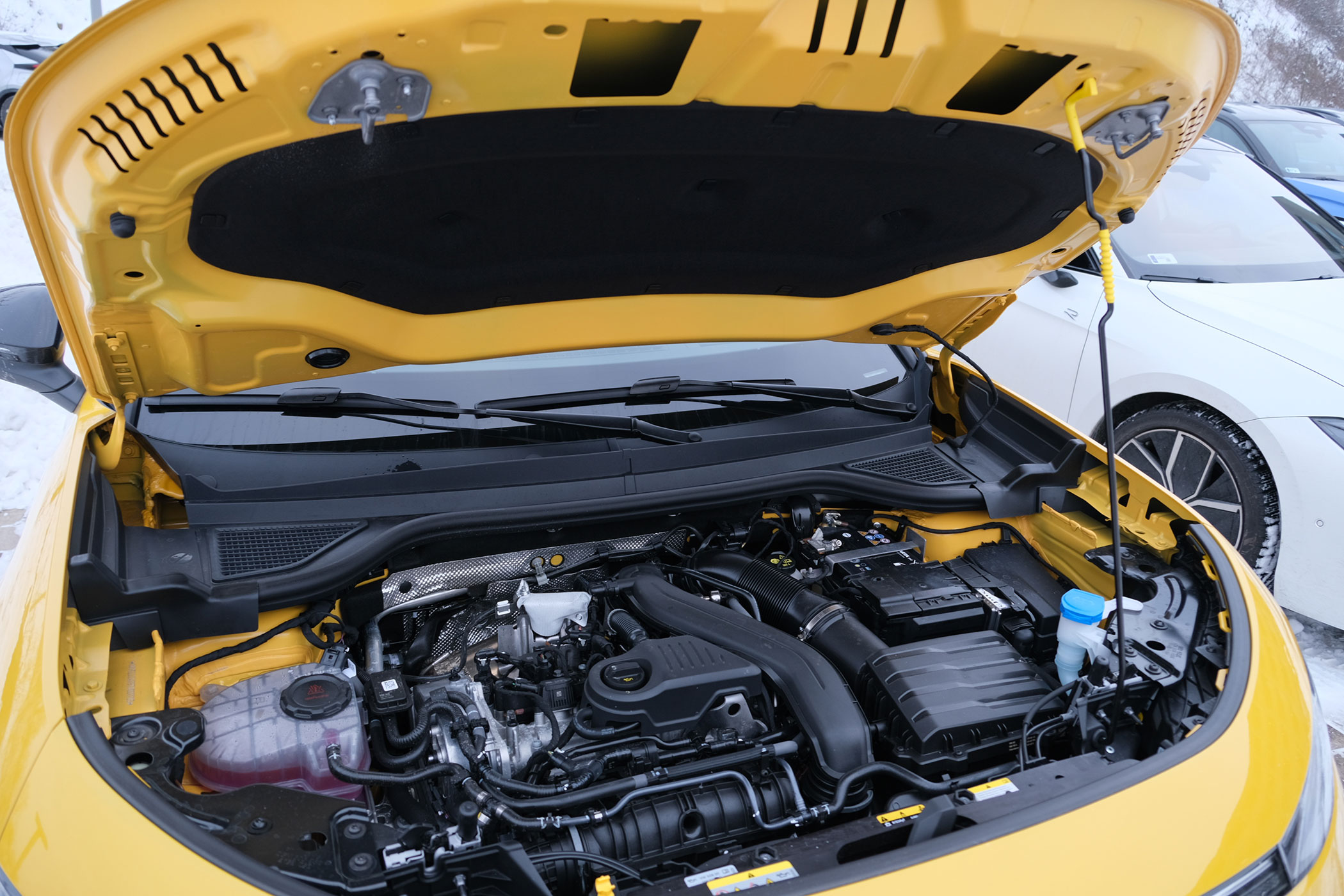 Nem jutott teleszkóp a T-Rocnak a motorházfedél felemelésére. Fontosabb ennél, hogy a 115 lóerős alapverzió motorja is a négyhengeres 1,5 TSI