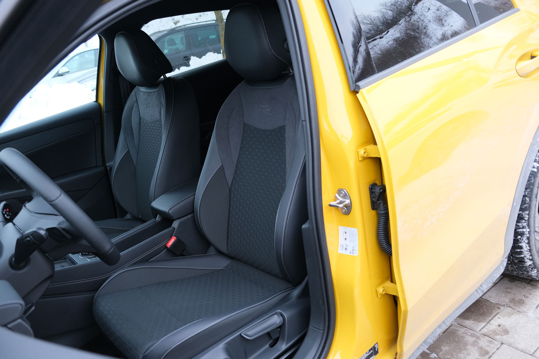 Sportosabb külsőt kap az R-Line-kivitel, eltérő mintázatú hűtőráccsal. Hatszögek helyett rombuszokból áll a mintázat a levegőbelépők előtti rácsozásban és az egész felület fényes fekete a matt helyett. Elsőre a Style-ra hittem, hogy a sportosabb külsejű verzió, de az R betű az orron, az első sárvédőkön és a belső térben segít azonosítani a kivitelt.