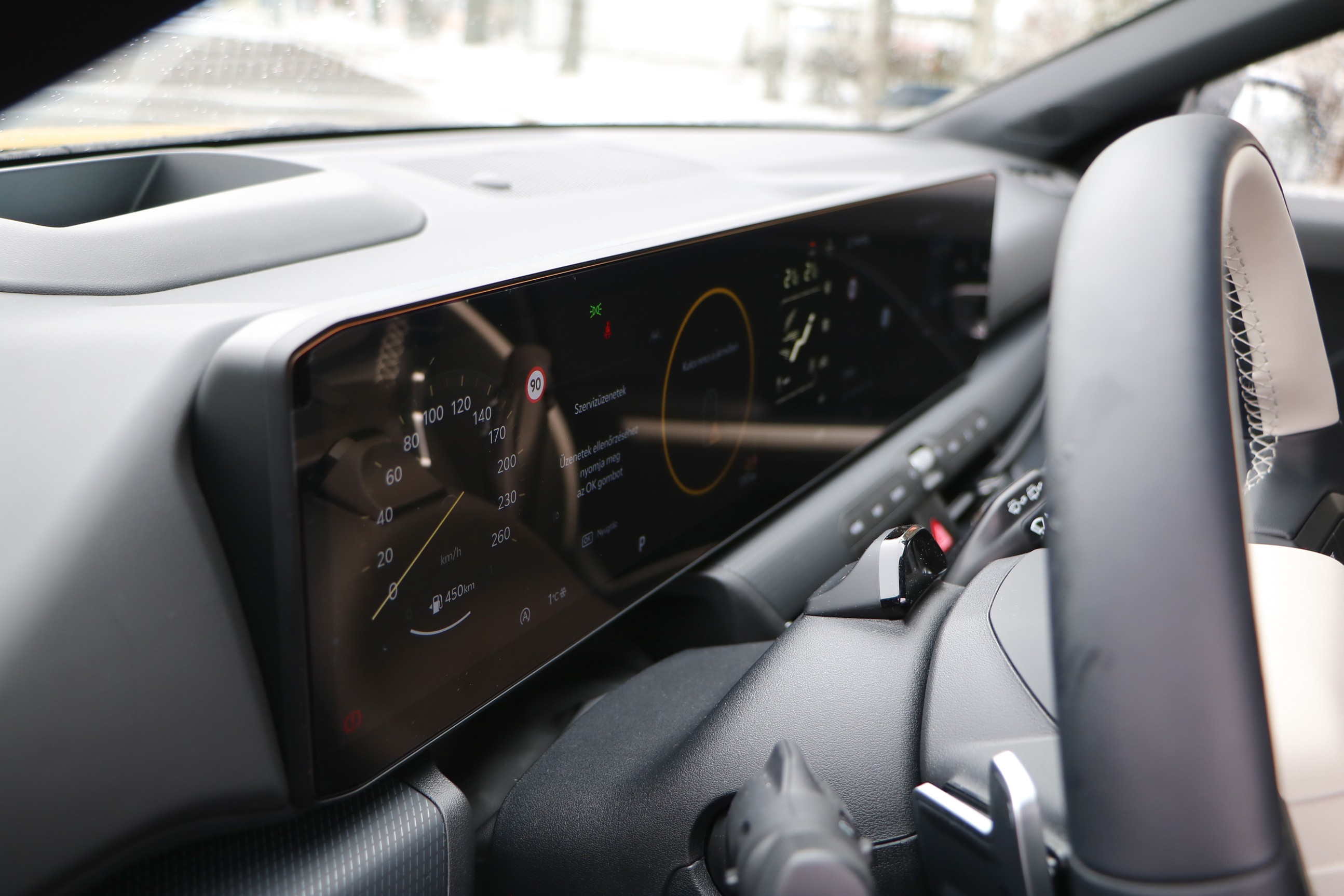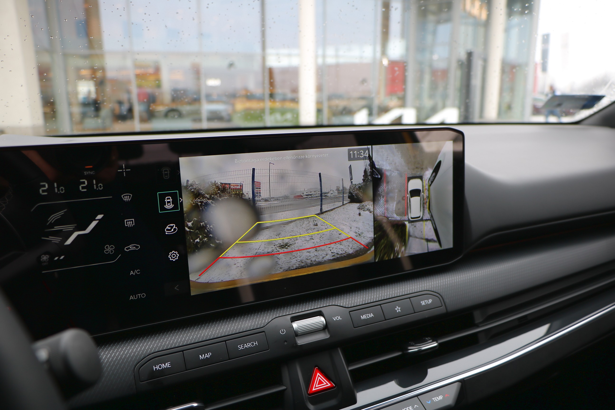Beülve mondhatni a tipikus Kia-kabint kapjuk meg logikát, kialakítást tekintve. Itt is adott az évek óta használt és bevált vízszintes dupla kijelzős panel, amiben a szokásos kettő helyett már három, egymásba érő kijelzőszegmens lakik. Adott a régi időket idéző 12,3 colos műszeregység, mellette egy klímának dedikált 5,3 colos rész, majd jobb oldalon ott a fedélzeti rendszert, és minden digitális funkciót vezérlő képernyő, 12,3 collal.
