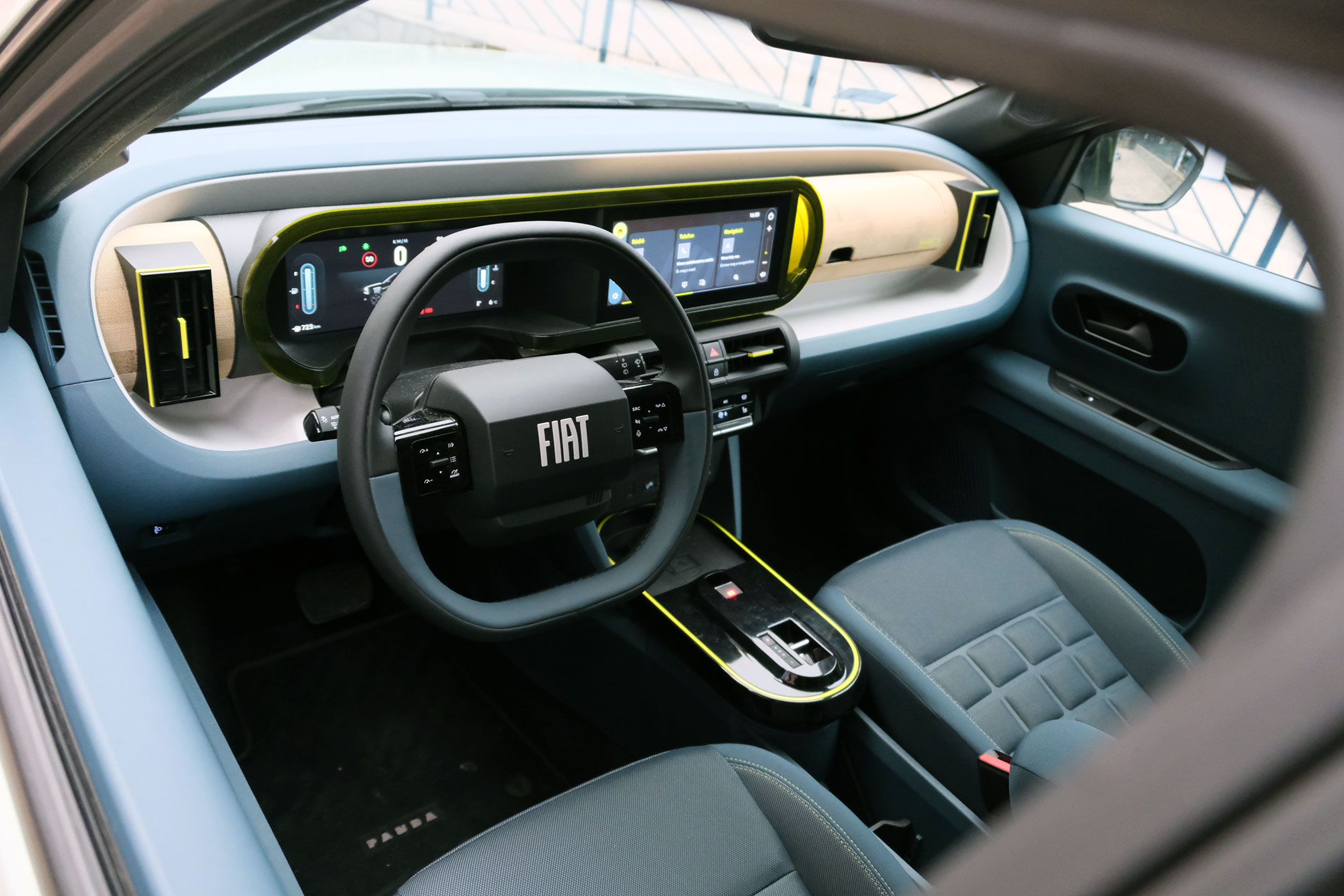 A Grande Panda annyira derűs és barátságos autó, hogy szinte minden utasom megdicsérte ötletességét és vidámságát, főleg a nők. A kék és a neonsárga kontrasztszín, a műszerfal sárga kerete, az üléskárpitok dombornyomott kockamintája a kékes textillel és a sárga varrással nagyon jól néz ki. Nem beszélve a MADE WITH LOVE IN FIAT hímzésről az üléstámlán.