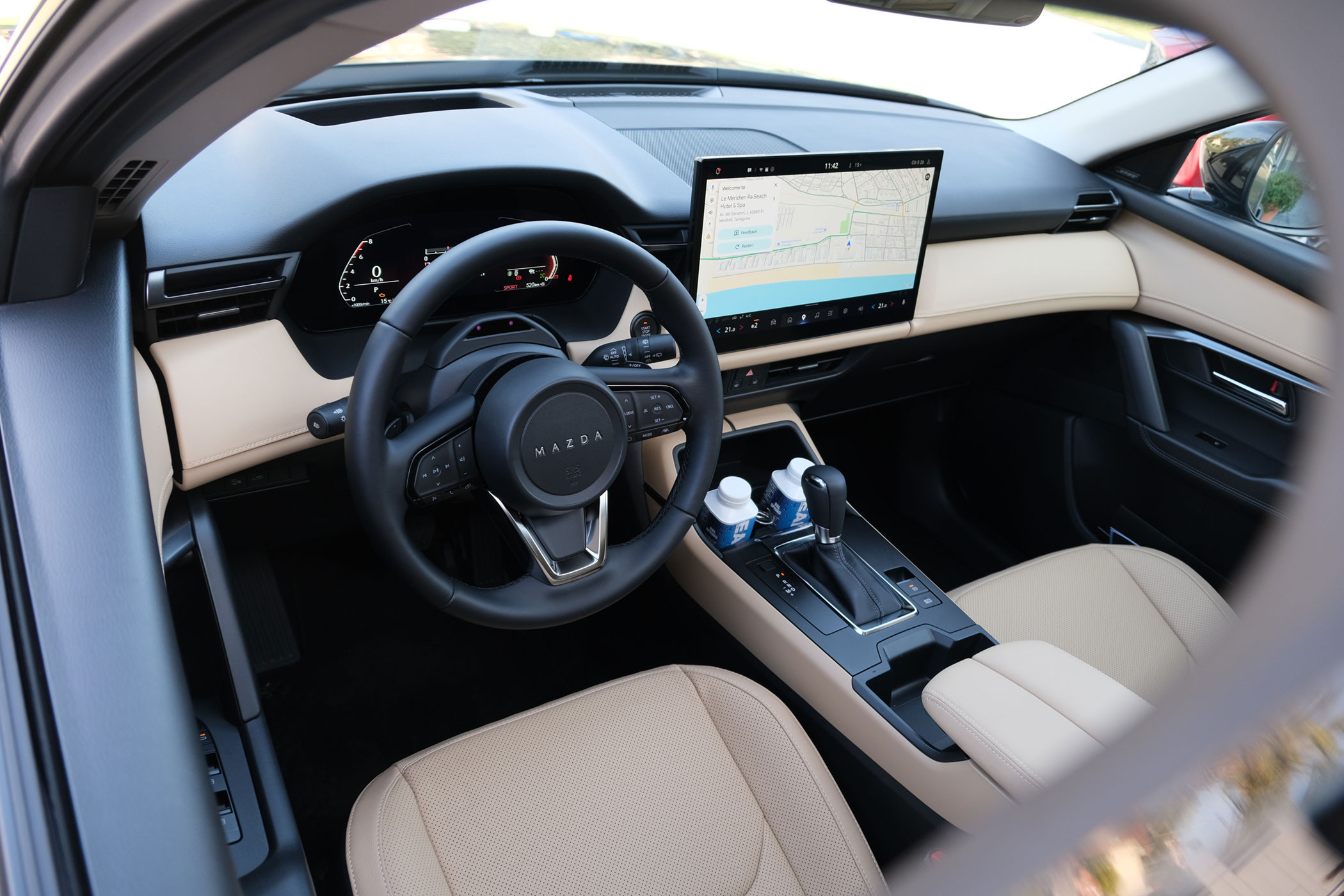 Klasszikusan kerek, lapításoktól mentes kormánykerék fogad itt is, a kínai Mazdák kétküllős volánjával szemben a megszokott háromküllős formában. A vezetőülés kényelmes, de ebben a kategóriában illene a deréktámasz magasságát is állíthatóvá tenni, nemcsak a feszességét. Az üléshelyzet jól beállítható, nem muszáj magas bakon billegned.