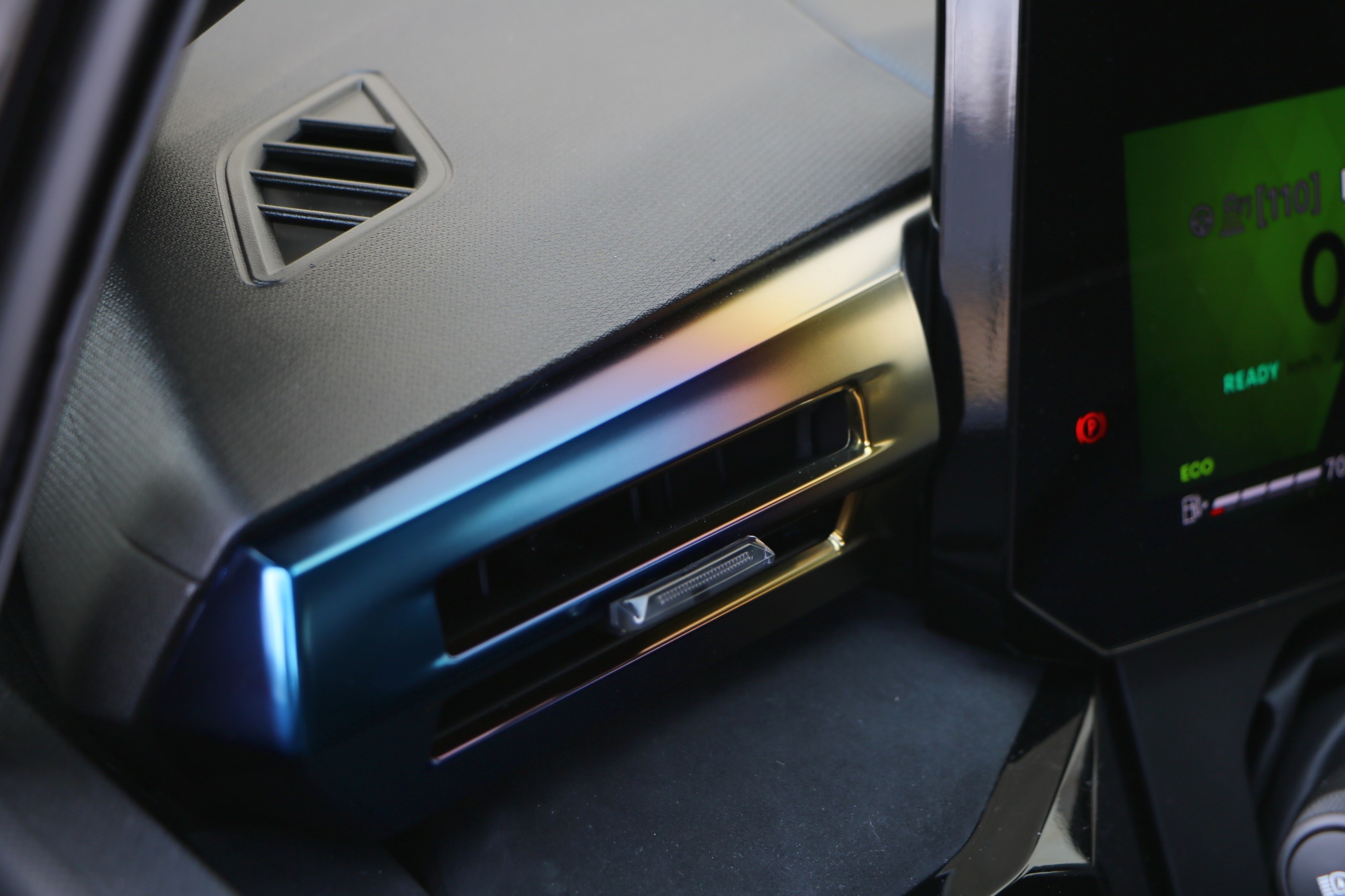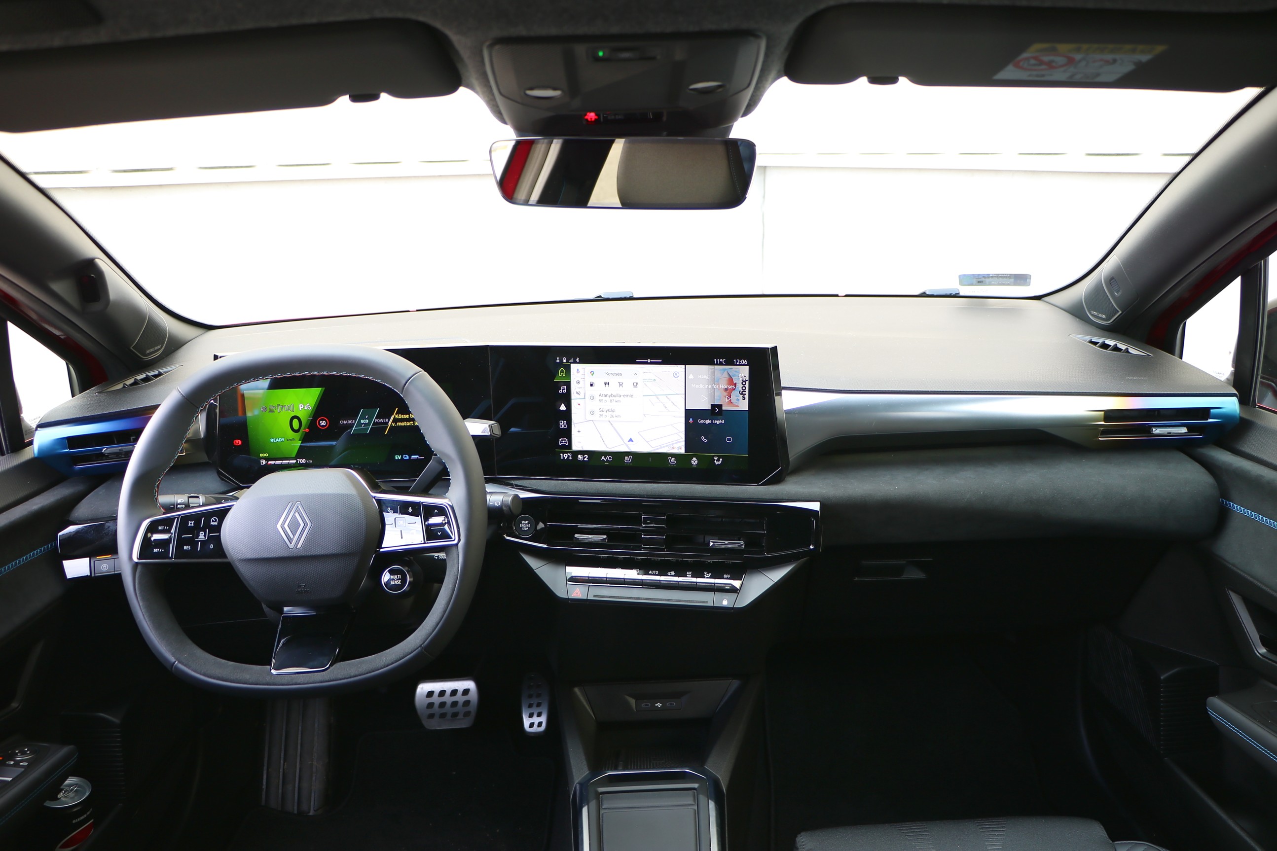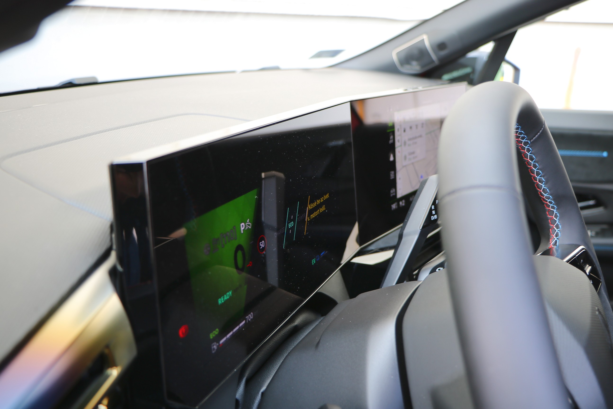 Tehát felnőttes, komoly, sportos a beltér, de mégis egész színes, és ez főleg a kabin méretéhez mérve hatalmas kijelzőknek köszönhető. A vezető előtt és a középkonzolon is egy-egy 10 colos kijelző kapott helyet.