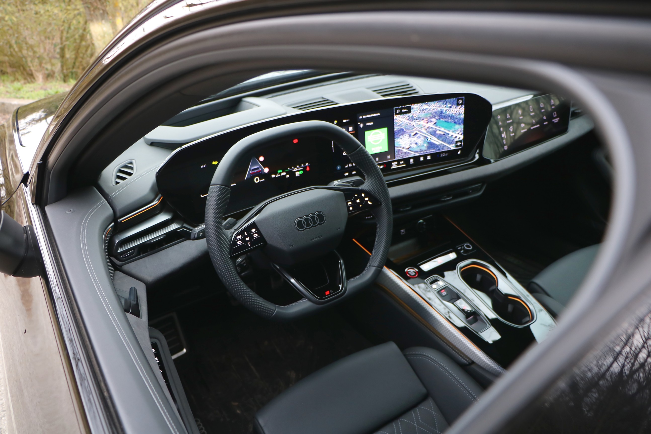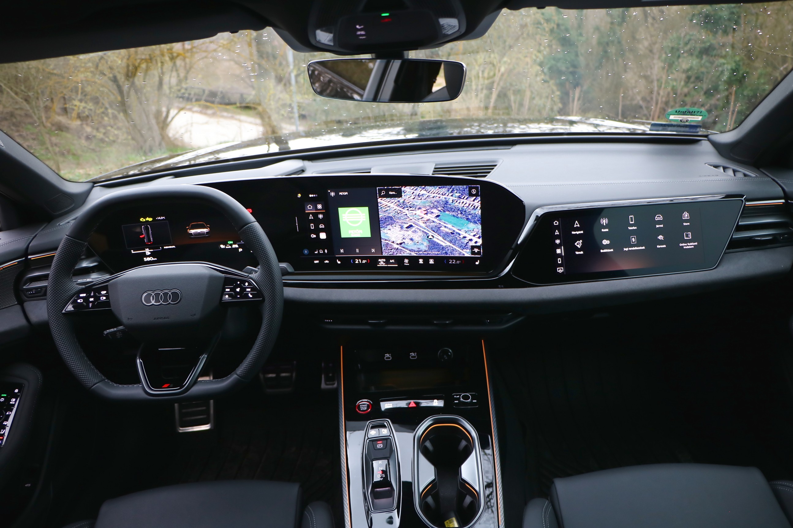 Azt el kell ismerni, képernyőből nincs hiány: a vezető előtt egy 11,9 colos, szabadon konfigurálható Audi Virtual Cockpit Plus kijelző ível, amely szervesen kapcsolódik a középpontban elhelyezett, 14,5 colos ívelt OLED  érintőképernyőhöz. A harmadik kijelző a jobb első utas előtt kapott helyet: ez egy 10,9 colos panel, amelyen az utas akár menet közben is nézhet videókat.