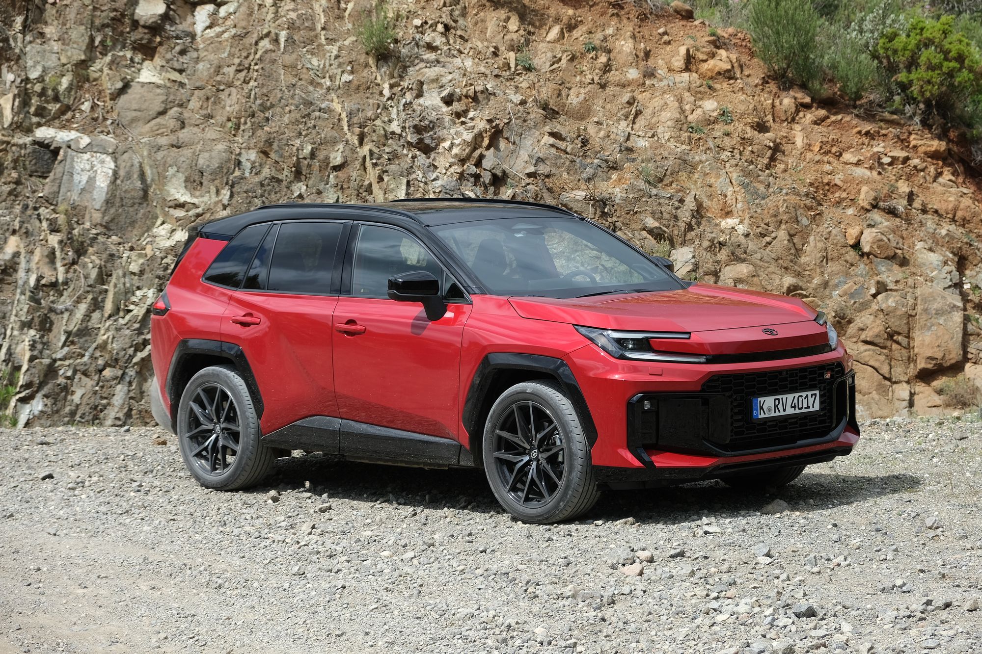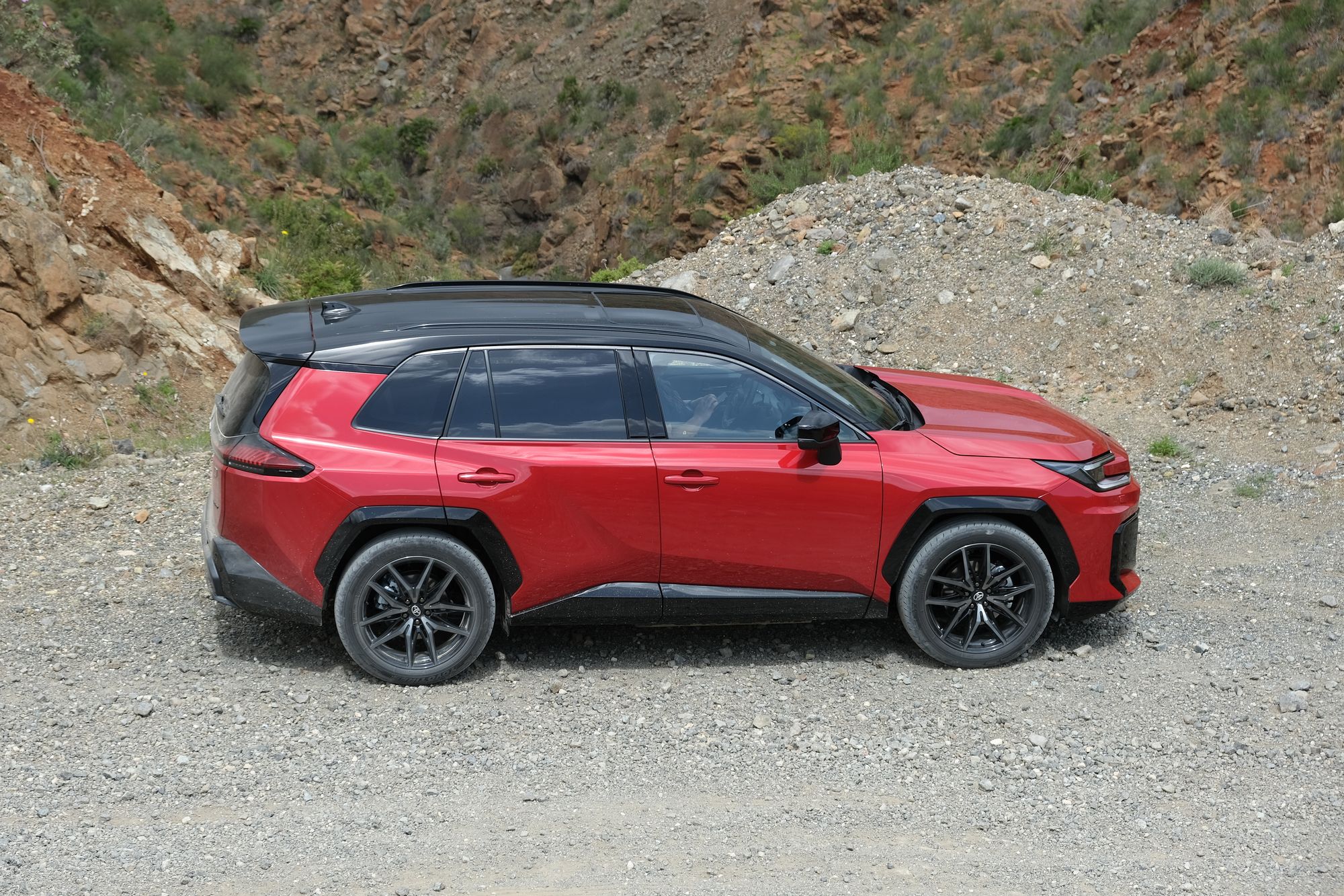 A dél-Spanyolországba szervezett menetpróbán két RAV4-et próbáltunk ki. A képeken szereplő szürke kocsi egy fronthajtású sima hibrid, 185 lóerővel, a piros pedig a csúcsmodell, egy GR Sport, állandó összkerékhajtással, 307 lóerővel, precízebbre, érzékibbre hangolt futóművel és kormányzással. A piros volt a jobb, mily meglepő.