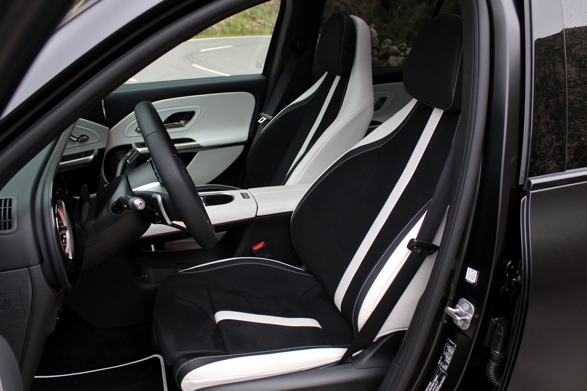 Kényelmes, remek oldaltartású ülések vártak az autóban, mely gazdagabb felszereltségnél relaxáló masszázzsal teszi pihentetőbbé az utazást. A fejenként kb. 40 kilométernyi vezetési lehetőség alatt azonban nem feltétlenül erre fókuszáltunk a Night Package csomaggal éjfeketébe öltöztetett GLB 350 4MATIC-ban.