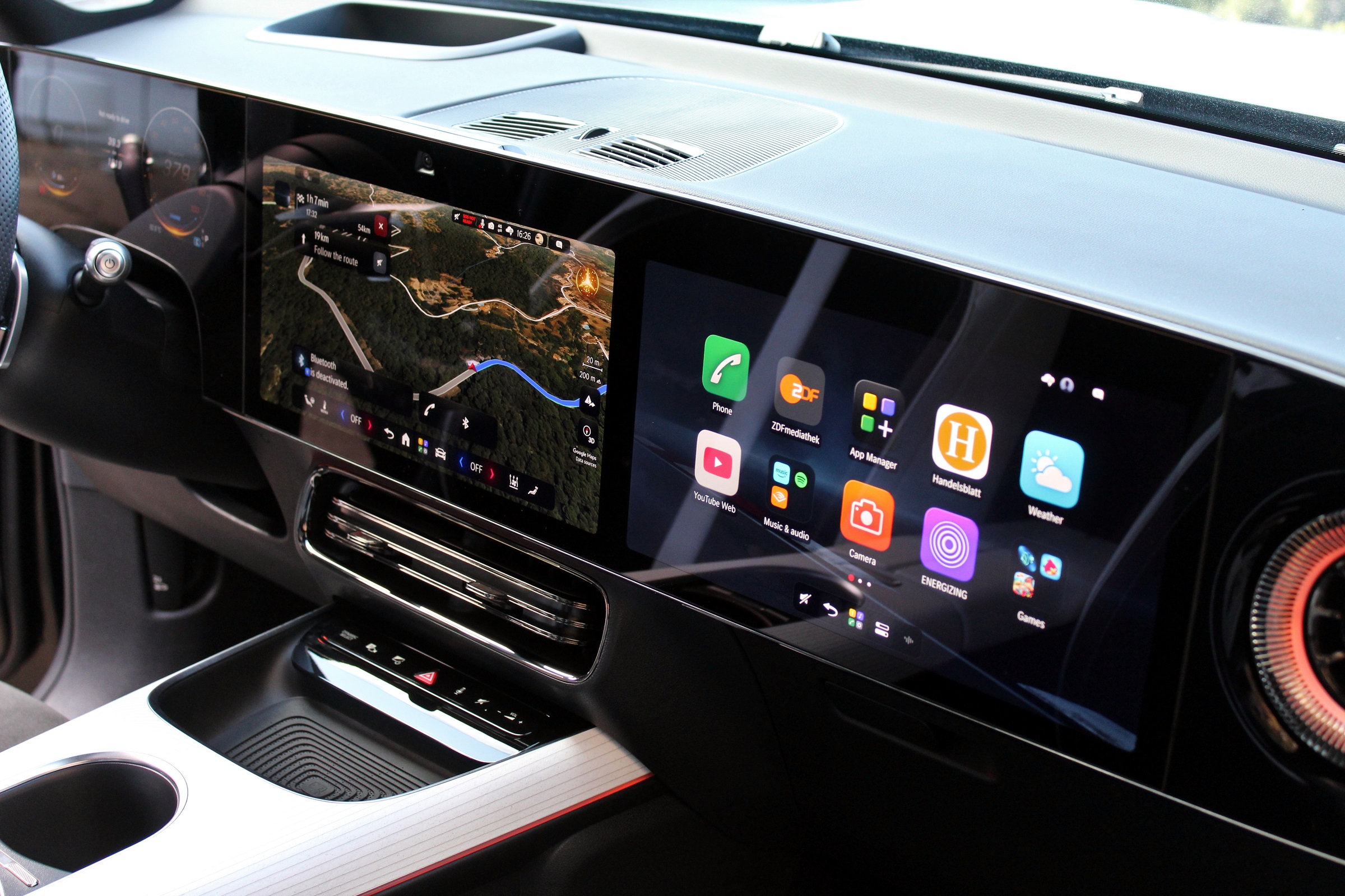 Érdekes volt, hogy sofőrként lényegében teljes rálátásom volt menet közben az utasoldali kijelzőn zajló dolgokra. Ezt időnként azért a szemmozgást figyelő belső kamera kiszúrta, és olyankor lekapcsolta azt a képernyőt. A Mercedes direkt nem vetett be betekintésgátló bevonatokat, fóliákat: mint mondták, ez egyrészt a képminőséget, másrészt a fényerőt is rontotta volna, harmadrészt pedig az autótöltés alatti, utassal együtt mozizás lehetőségét venné el a sofőrtől.