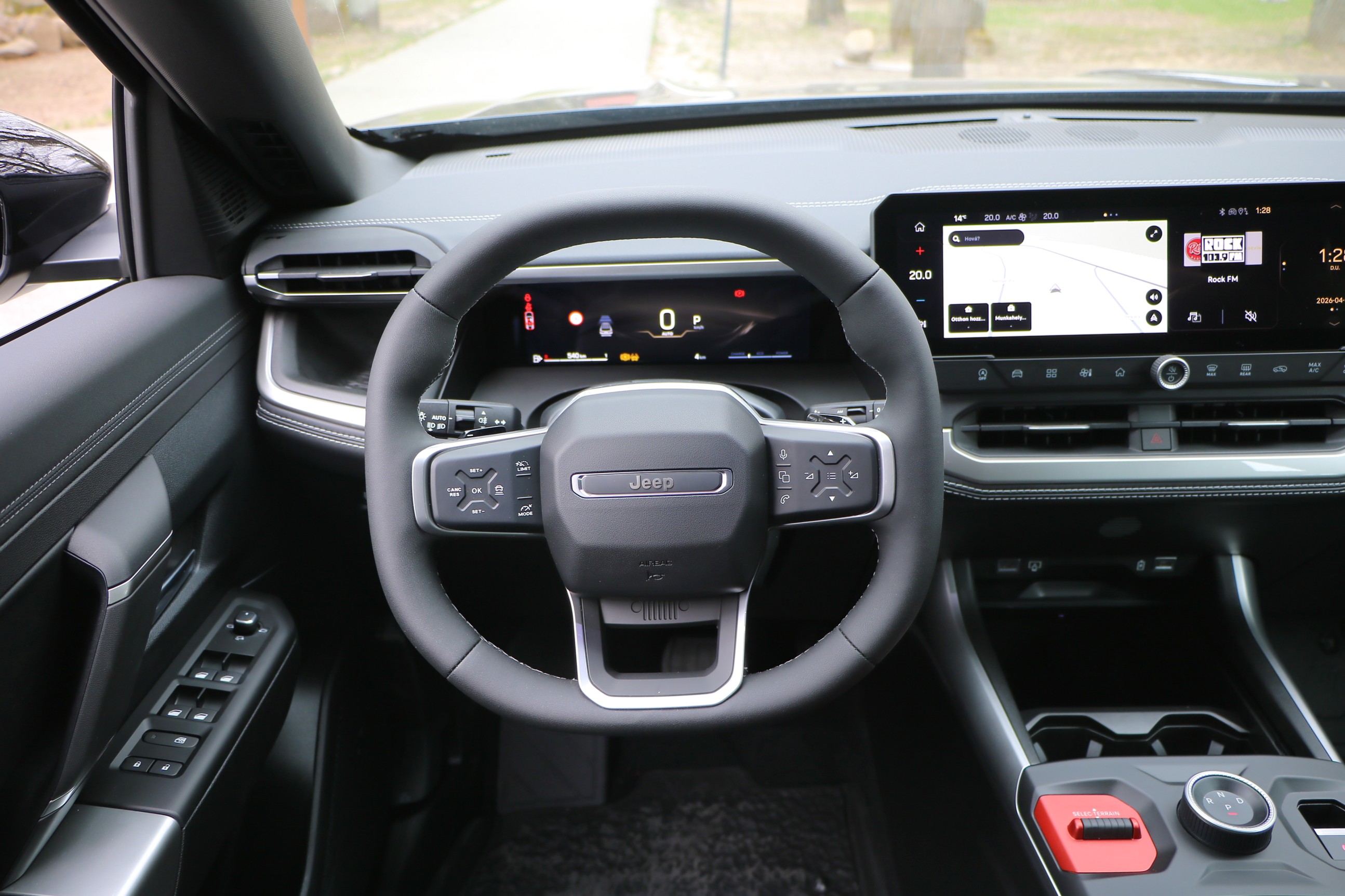 A Jeep indításához nem billenőkapcsolóval, hanem egy forgótárcsával lehet kiválasztani az irányt, manuális váltó ehhez a típushoz sincs, de mégis a középkonzolra rakták ezt a kezelőszervet. Mellette vörös kerettel találjuk az üzemmód kapcsolóját, amivel némileg befolyásolható az autó viselkedése.