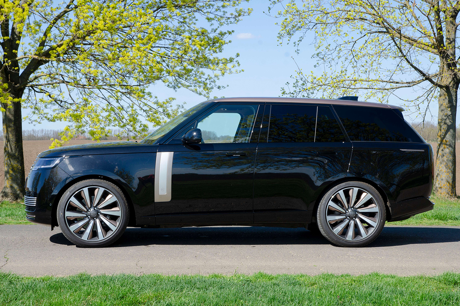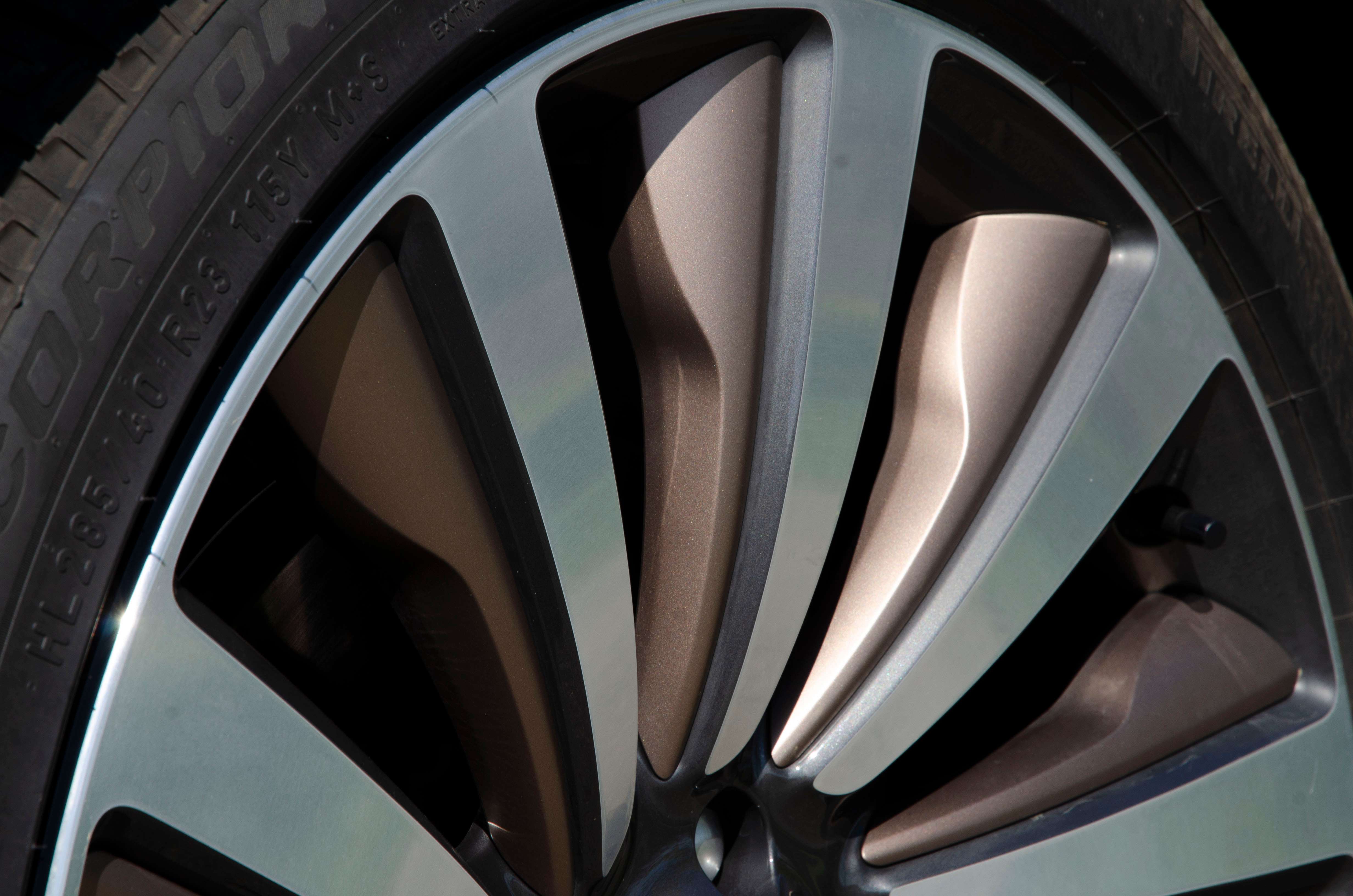 A tesztautó színe papíron fekete (Santorini Black), de surlófénynél én felfedezni véltem benne mélyzöld festékpigmenteket. Nagyon elegáns és ízléses, ahogy a tető bronz (Corinthian Bronze) színe harmonizál a 23 colos felnik belső élével. Egyébként ez a tetőárnyalat 603 ezer forintos extra, csak úgy csendben jegyezném meg.