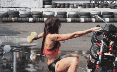 Legalábbis ha a krómrúdon szocializálódott művésznő úgy gondolja, hogy a letámasztott motor is van olyan stabil, mint a padlóba és a mennyezetbe dűbelezett acéloszlop. Bár a jelenet végét jó érzésű alkotója levágta, azért el tudjuk képzelni a sikongatást, amivel a mutatvány zárult. Reméljük komolyabb baja nem lett a hölgynek, és felépülése után valami masszívabb járgány oromdíszeként csodálhatjuk majd meg.