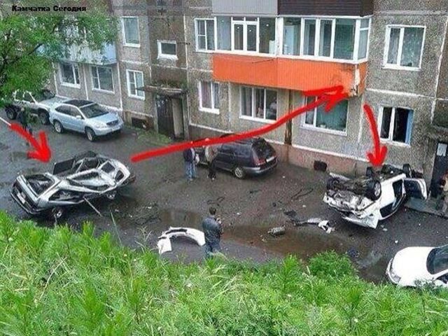 Tehát az ismeretlen lakótelep ismeretlen lakói olyat láttak reggel kilépve az ajtón, amit életük végéig sem felejtenek el. Két autóroncs hevert a parkolóban, valamint egy ütközés nyomai az első emeleti erkélyen. Hogy sikerült ezt összehozni? A recept: Vodka+Subaru+sebesség.