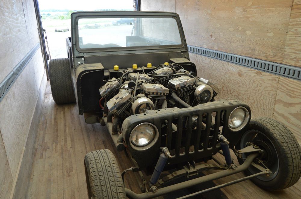 Nem mindennapi építés, a négy Harley-Davidson Evolution összhangjával gumit csikorgató, Hot Rod hangulatú Jeep beindítja a fantáziát.