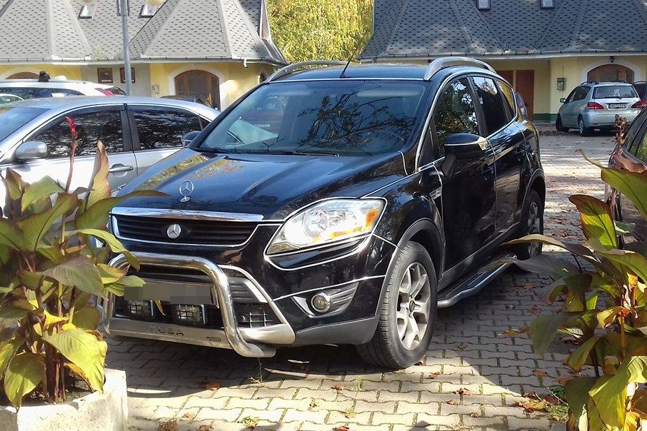 Olvasónk küldte nekünk ezt a jobb sorsra érdemes Ford Kugát, melyet tulajdonosa rettentő kínos módszerrel szeretne Mercedesszé varázsolni. A Mekk Elek-díjas tuningmesterektől tanulhatta el, hogy a mértékletesség nélkül használt krómléctől minden hirtelen drága és elegáns lesz, ezért ezen cseppet sem spórolt az alkotó. Jutott mindenhová, az ajtók élére, a lámpák köré és minden más helyre is. Természetesen nem maradhatott le az elrettentő gallyrács sem a kompozícióról, melyet indokolatlanul sok Merci-csillaggal tettek teljessé.