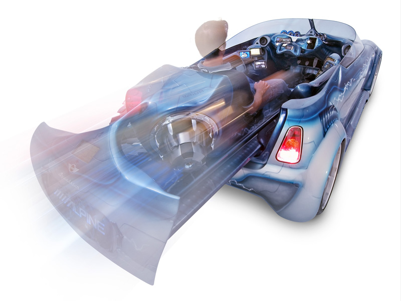 A gyártók is felültek erre a vonatra, a hifi pedig komoly szerepet képviselt az építésekben. Gyakorlatilag voltak komplett hangrendszerré épített kiállítási autók. Ezek tényleg figyelemfelkeltő darabok voltak, de talán mind közül a legdurvább az Alpine által 2004-ben összehozott Mini Speedster. Ez egy Xenomorph fészek és egy csicsás jakuzzi szerelemgyereke, és autóként már teljesen értelmezhetetlen.