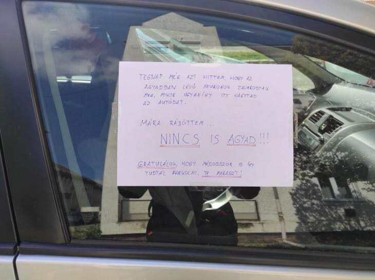 Erre hívja fel a figyelmet az egyik, post-itre körmölt cetli, amelynek szövege – kis helyesírási korrekcióval – az alábbi: „Szia, két helyre parkolsz. Majd figyelj oda, hogy csak egy helyet foglalj! Köszi!” A másik üzenet így szól: „Legyél szíves vonaltól vonalig állni!!! 2 helyen parkolsz, mögéd már nem fér be senki!”