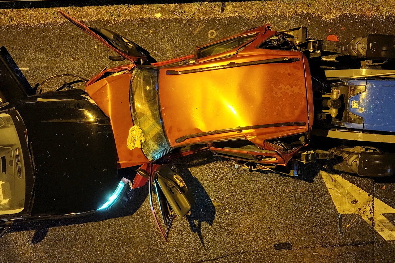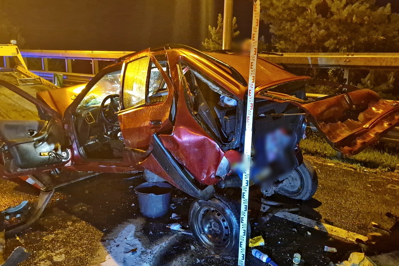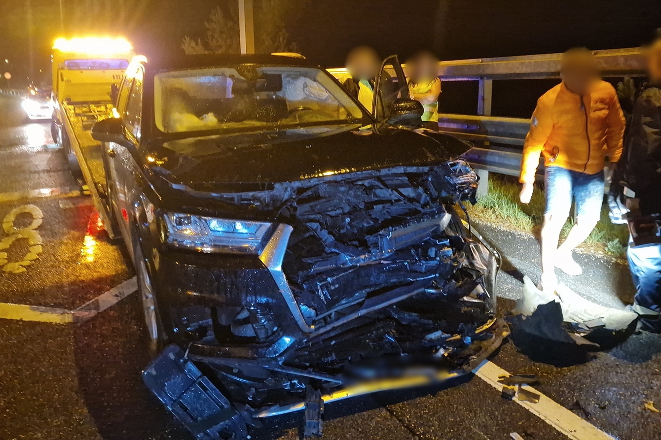 Súlyos baleset történt szombat hajnalban az M86-os autóút bevezető szakaszán: Szombathely közelében egy szlovák rendszámú Audi a forgalom elől elzárt területre hajtott, ahol frontális ütközött azzal a Peugeot-val, amiben egy vagyonőr ült, és a hat, egyenként többtonnás munkagépből álló sor elején parkolt.