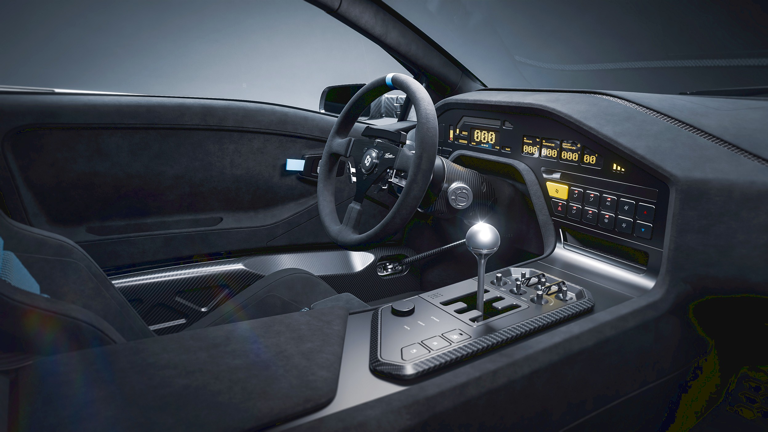 A beltér magáért beszél: alcantara, retró hangulatú digitális kijelzők, mart alumíniumkiegészítők és a jó üreg nyitott kulisszás váltókar teszik teljessé az élményt, a versenyautós vonal komolyságát pedig beépített tűzoltó rendszer mutatja.