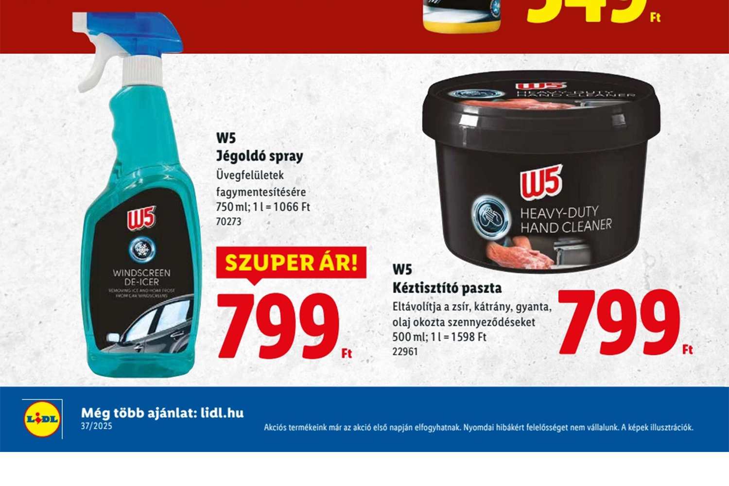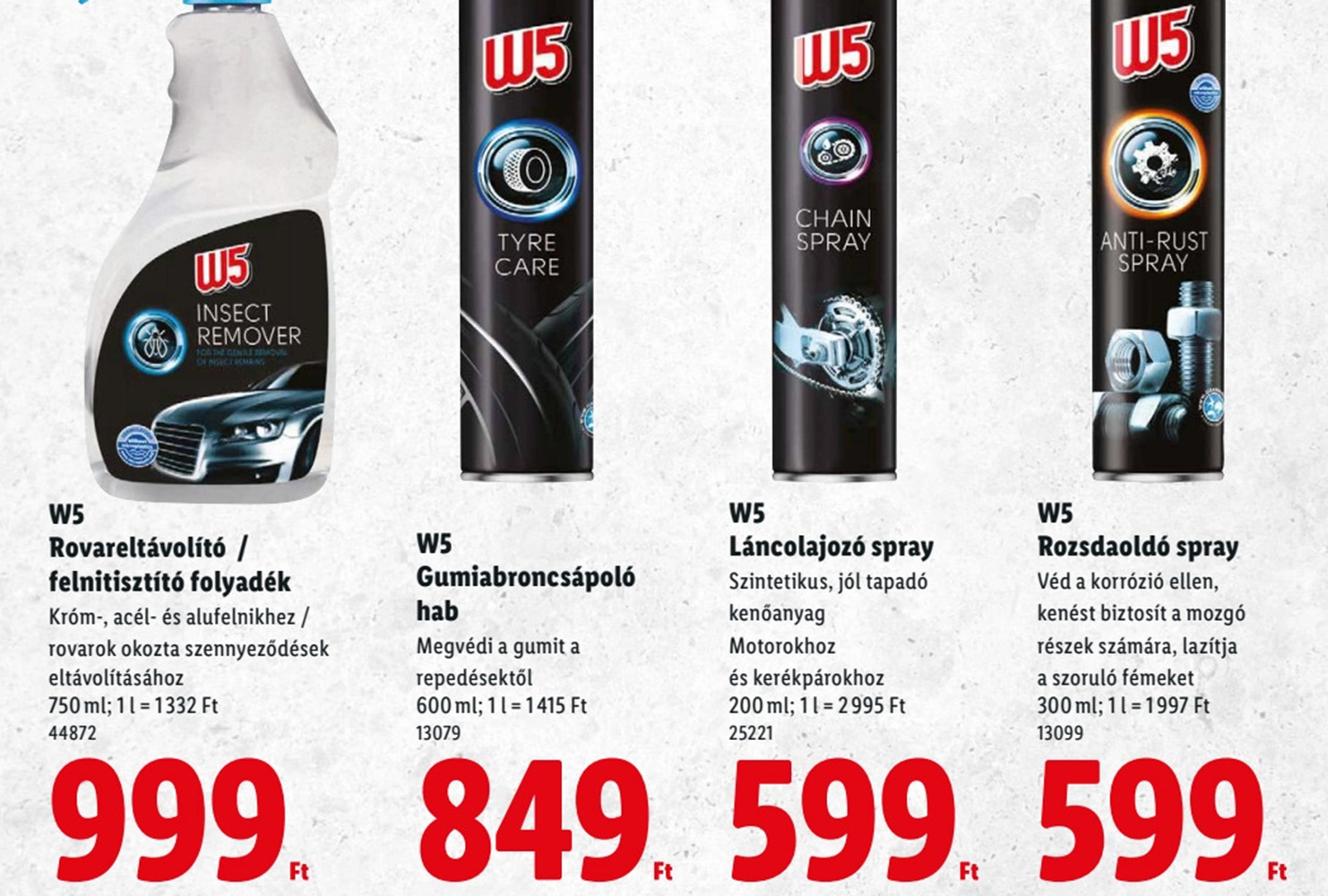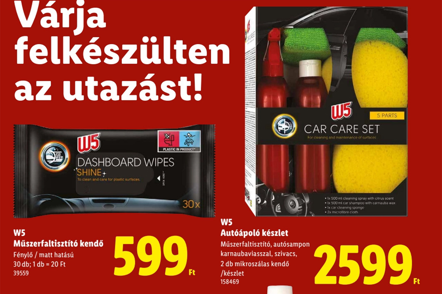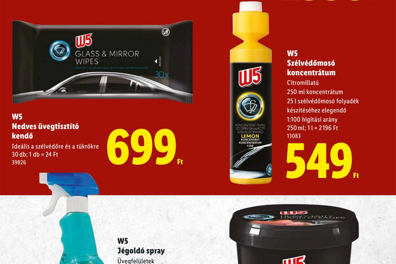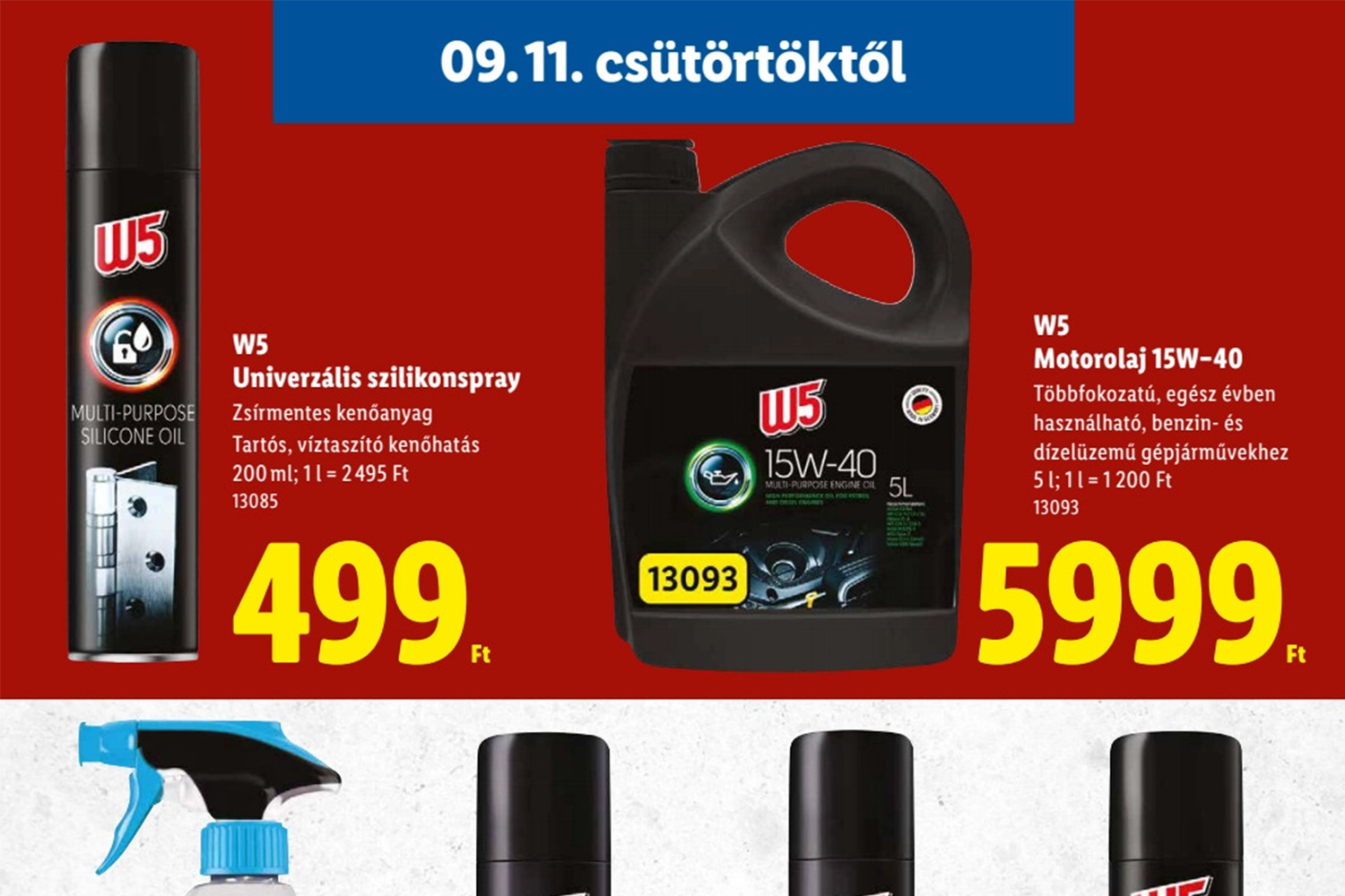 A Lidl külön szekciót szentelt a héten az autósoknak: van itt 15W-40-es motorolaj, rovaroldó spray, rozsdaoldó, felnitisztító, jégoldó, szélvédőtisztító, és komplett autóápoló készlet is.