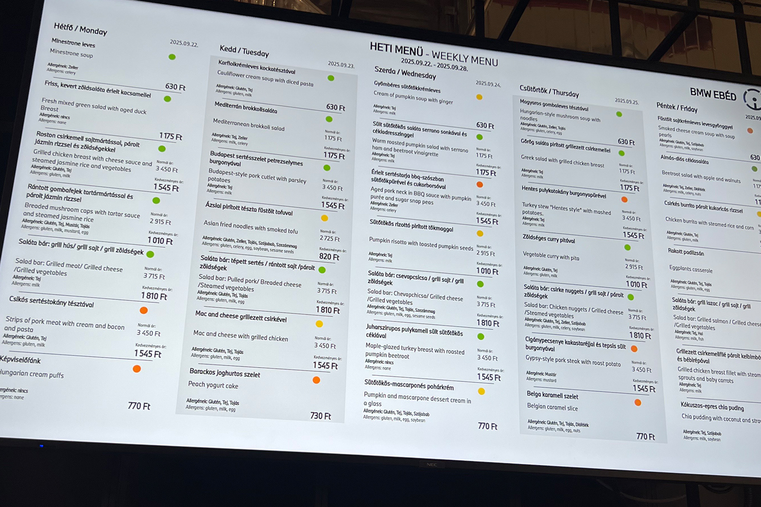 A normál ár egyáltalán nem olcsó, de a dolgozói kedvezménnyel azért már nagyon barátságosan lehet étkezni a BMW menzáján.