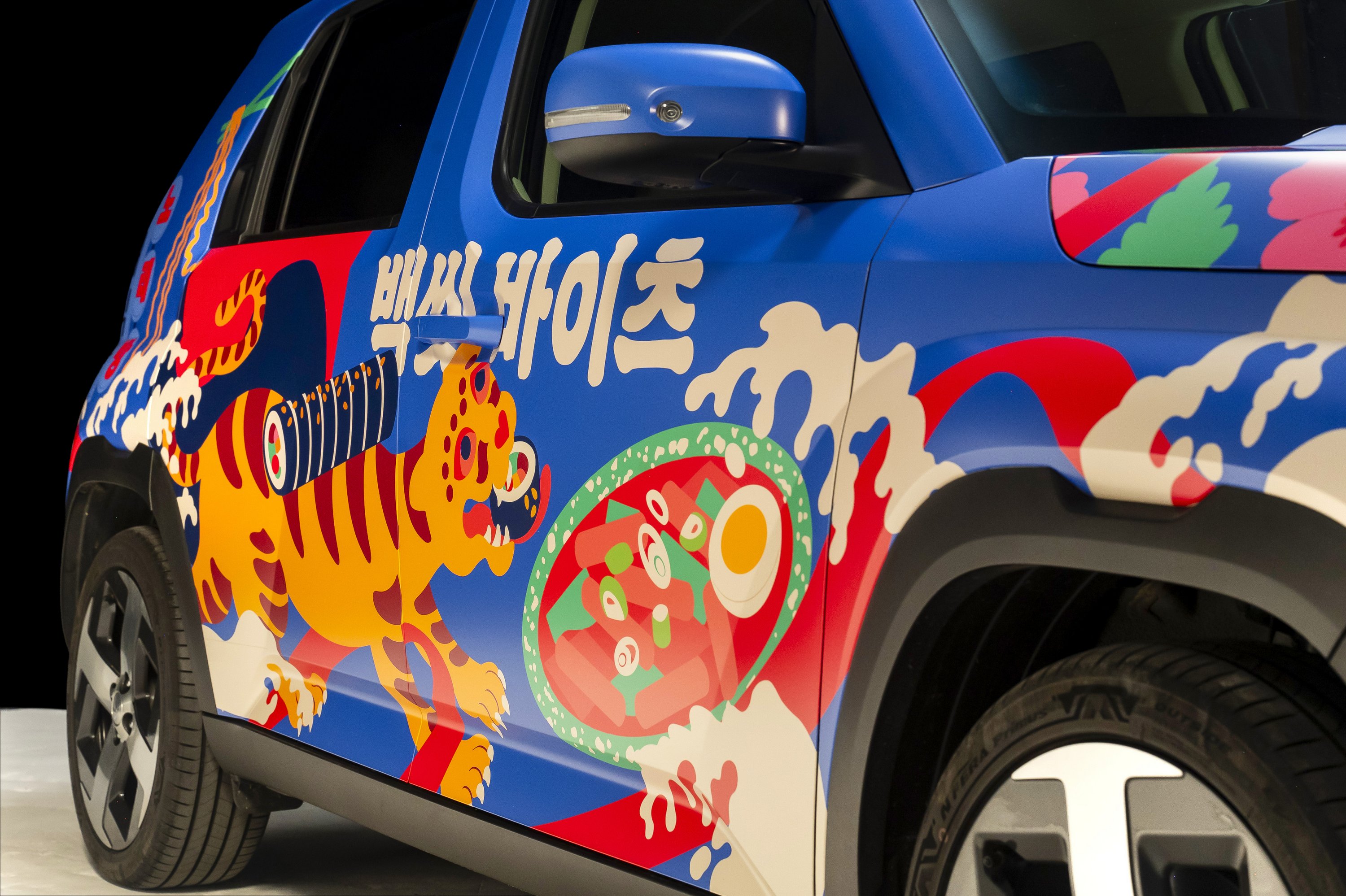 Az autó külső megjelenése sem maradt érintetlen: egy koreai grafikussal terveztettek rá színpompás, koreai ihletésű dizájnt.
