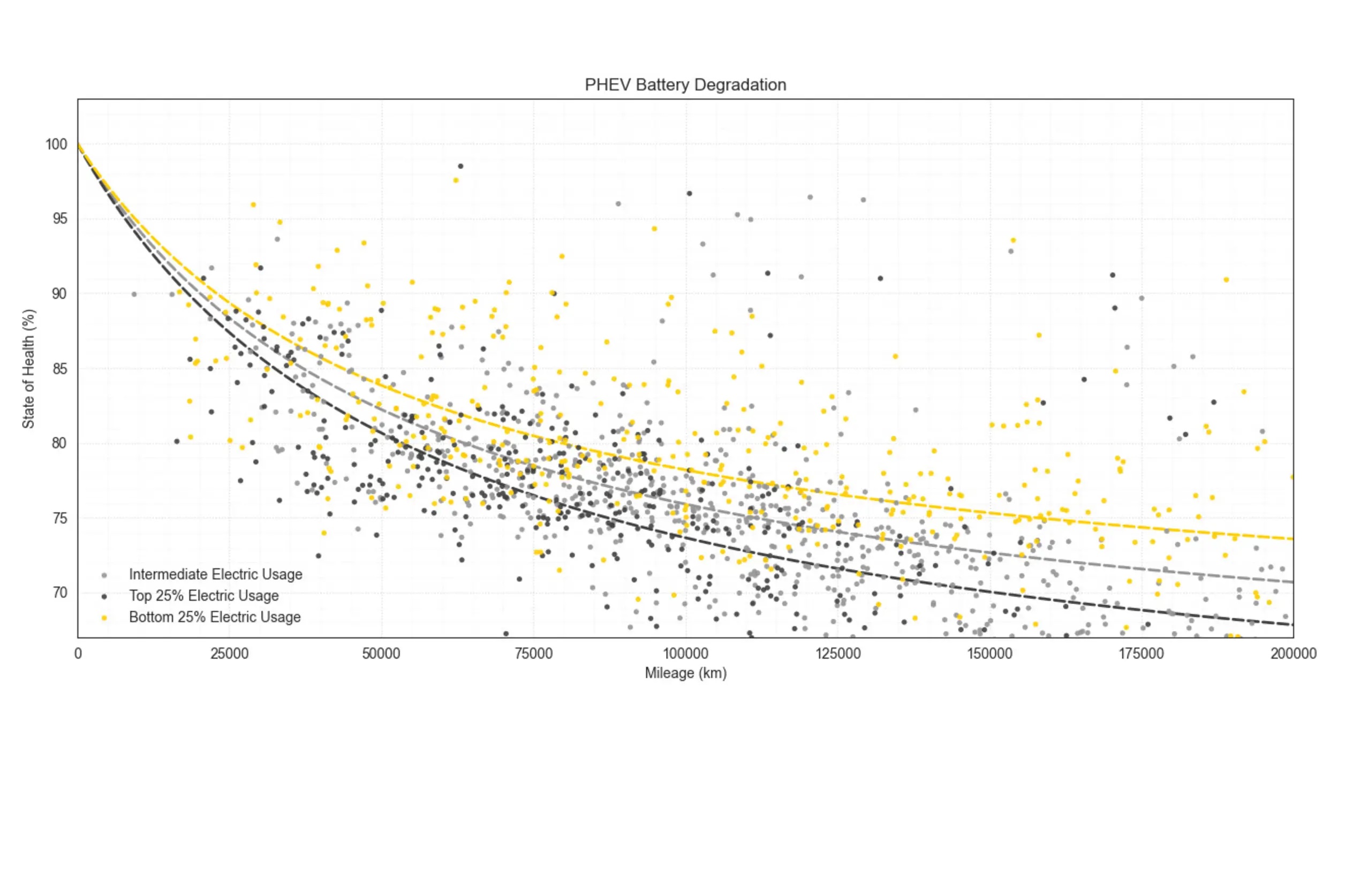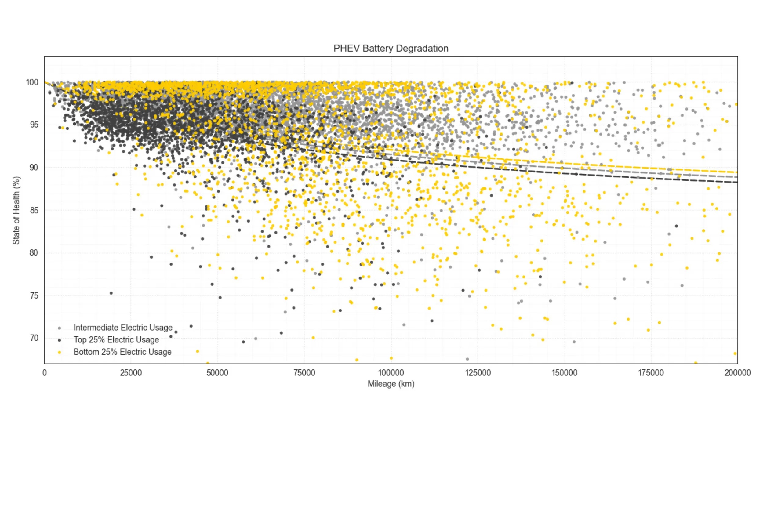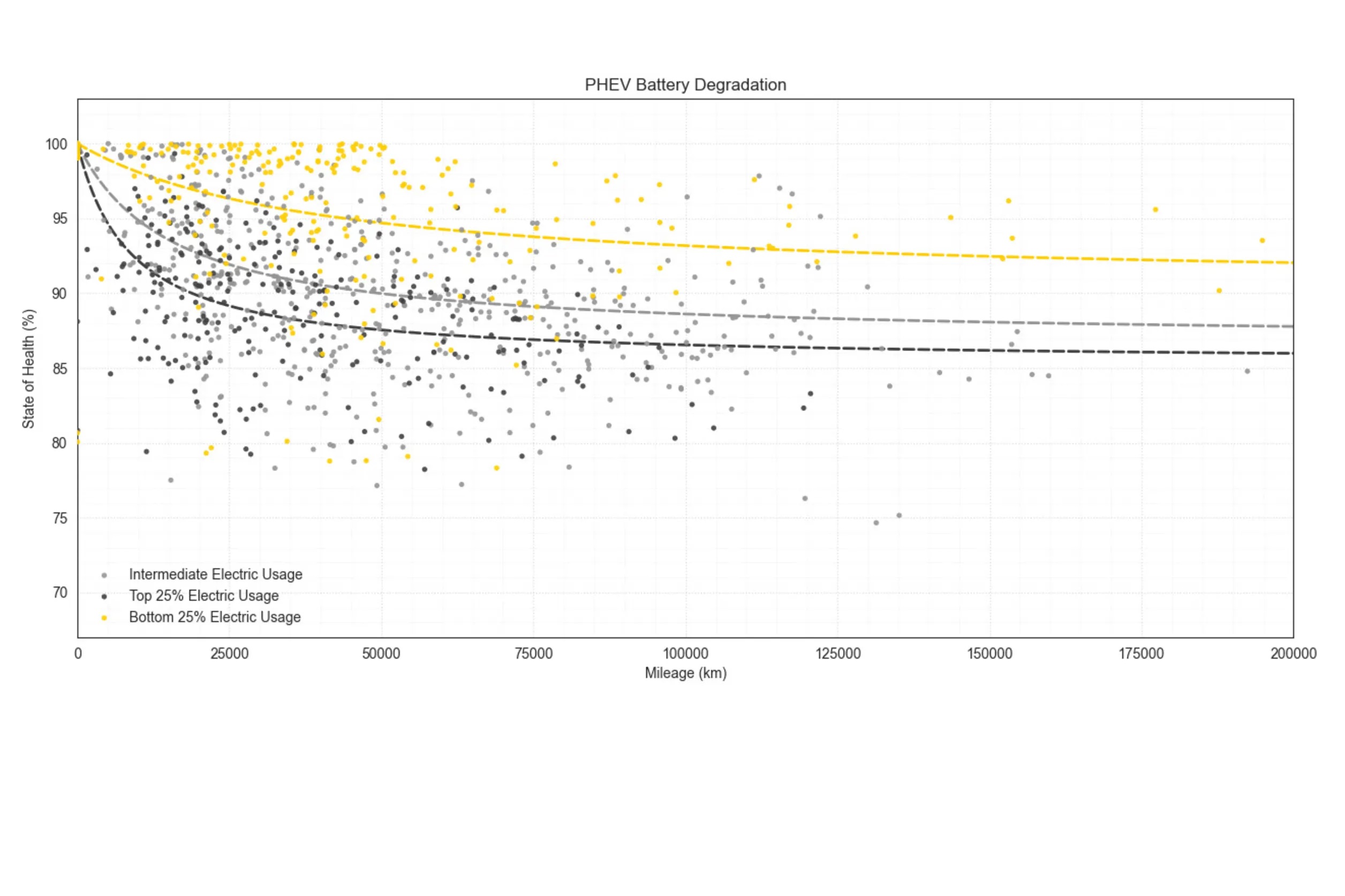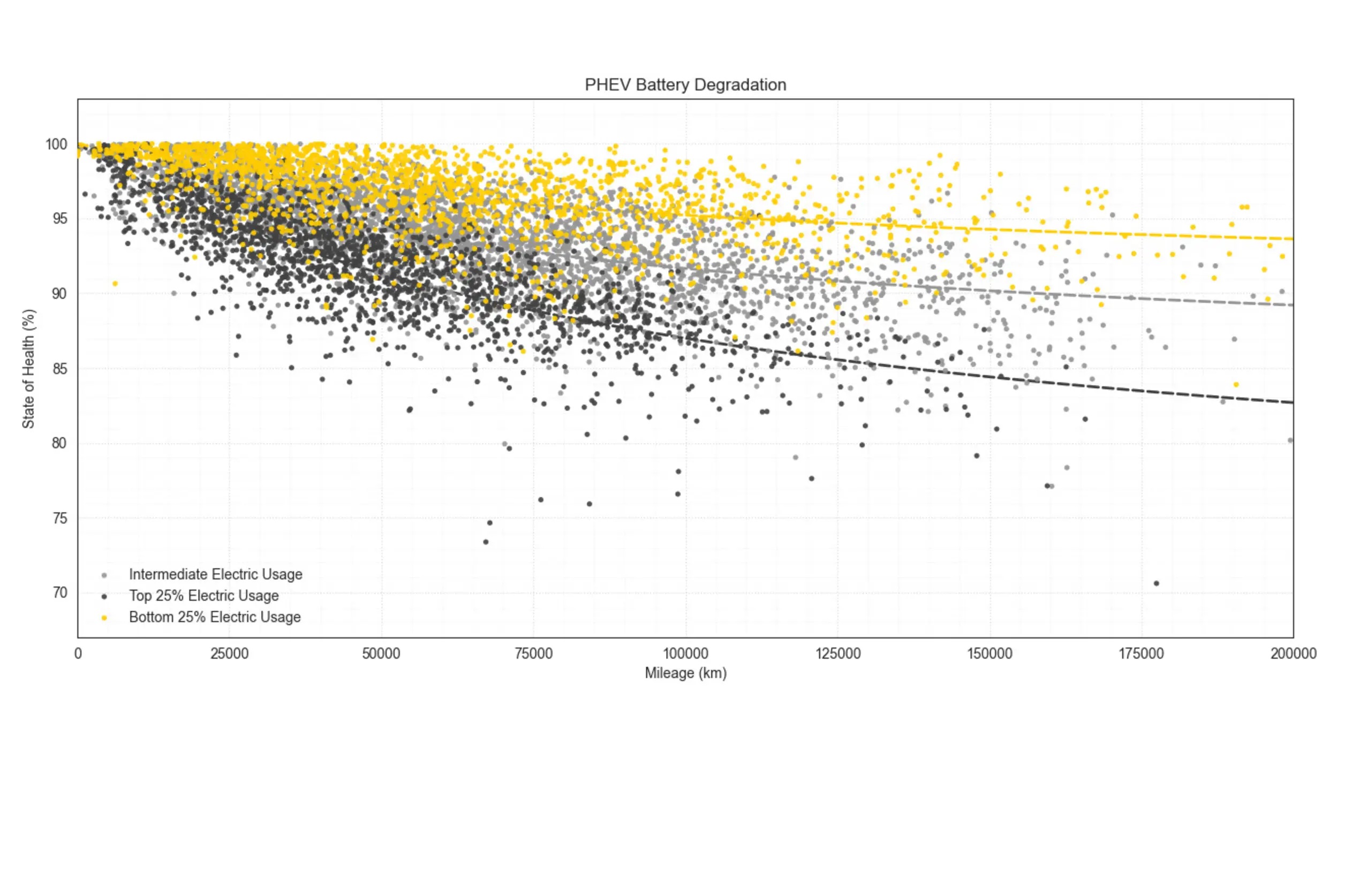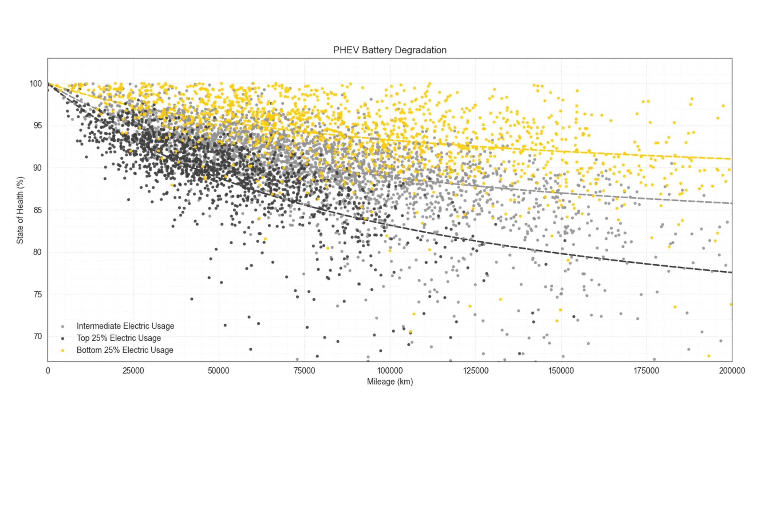 A mérések nagy átlagban egyébként azt mutatták, hogy 200 ezer kilométer után az eredeti kapacitás 85 százalékára eshet vissza az akkumulátorok „tudása”. Ettől persze lehetnek eltérések: aki kevesebbet autózik elektromos üzemmódban, annak az aksija 90 százalék felett is maradhat, míg aki többet, annak 82 százalékosra is romolhatnak a telepei.