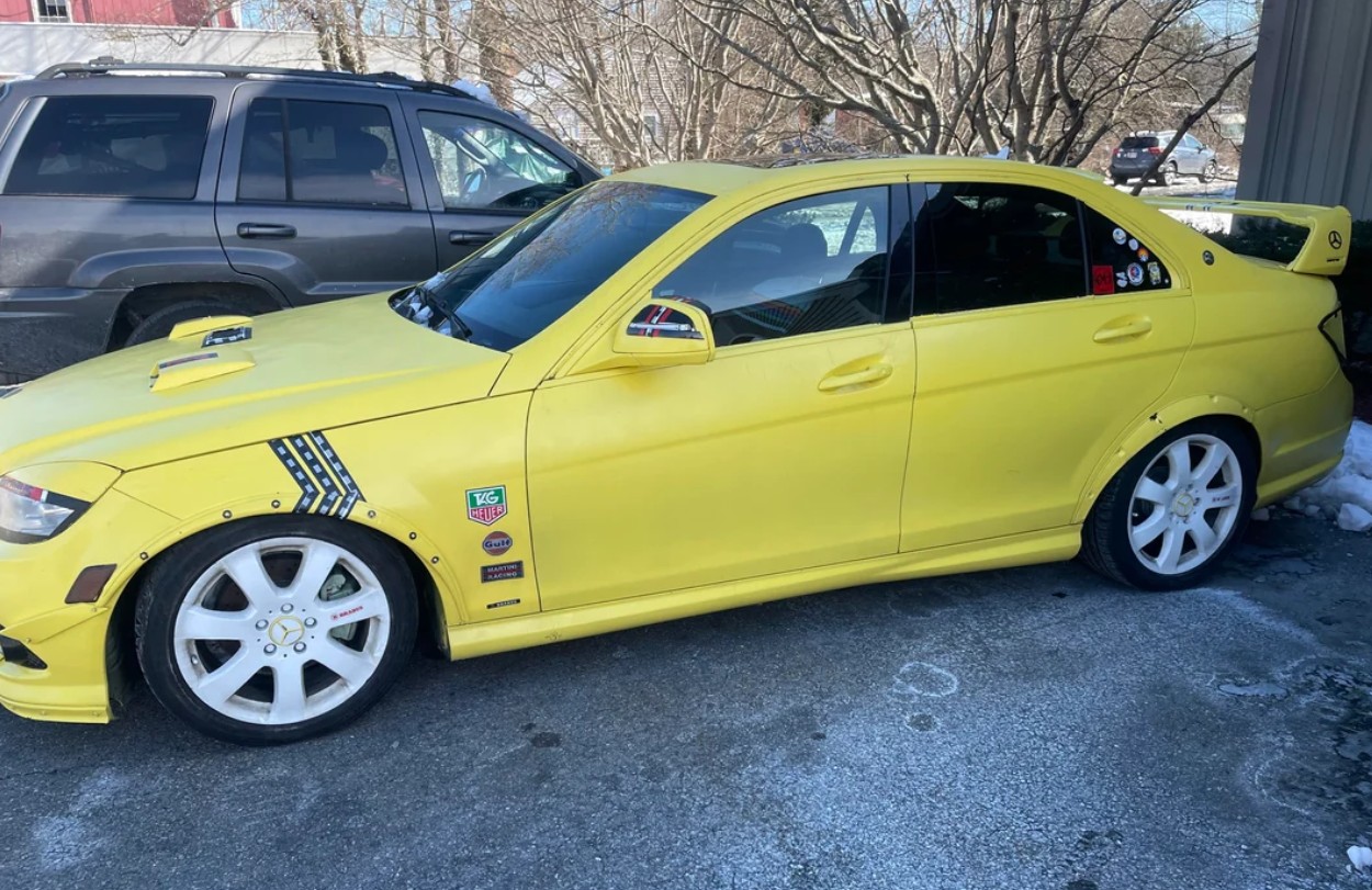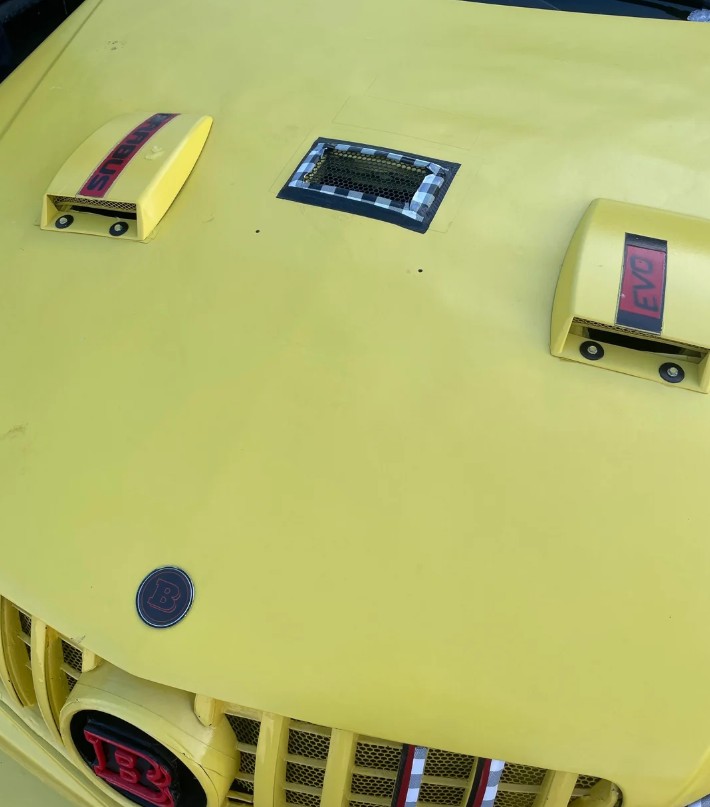 A látvány elsőre sokkoló, másodjára még rosszabb. Az autó egész felépítése olyan, mintha egyszerre akart volna M5 lenni, rallyautó, driftproject és cosplay-versenyző. A karosszéria minden négyzetcentiméterén találunk valami értelmezhetetlen kiegészítőt: karbonnak tűnő, de inkább temus levegőbeömlők, összevissza ragasztott fekete műanyag csíkok, és persze mindezt megkoronázza a háromszínű “M-fólia” – amely inkább emlékeztet egy gyerekeknek szánt játékautó csomagolására.