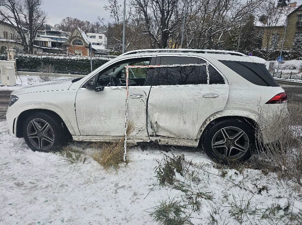 A Mercedes megcsúszott, átvágtatott a körforgalmon, majd az útpadkán állt meg. A sofőr a baleset következtében könnyű sérülést szenvedett.