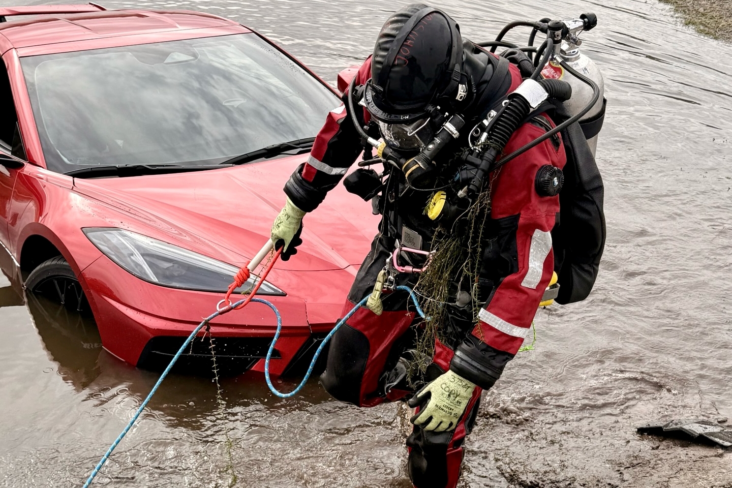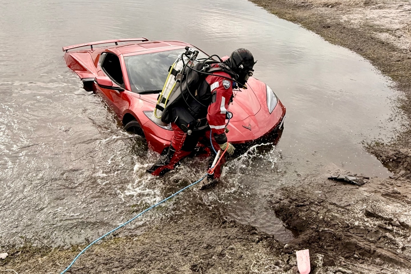 Képzett búvárok húzták ki a mocsárból a Corvette C8-at, ami a keréknyomok alapján rükvercben hagyta el a szárazföldet. Arra utaló jelekből ítélve valaki kimászhatott az utasoldali ablakon, mielőtt teljesen a víz alá került az autó. Az eset ellenére meglehetősen kevés a külsérelmi nyom, egyedül az első lökhárító repedt meg, azonban a belteret, az elektronikát és a hajtásláncot is meglehetősen érzékenyen érintő vízkárból fakadóan a totálkár garantált.