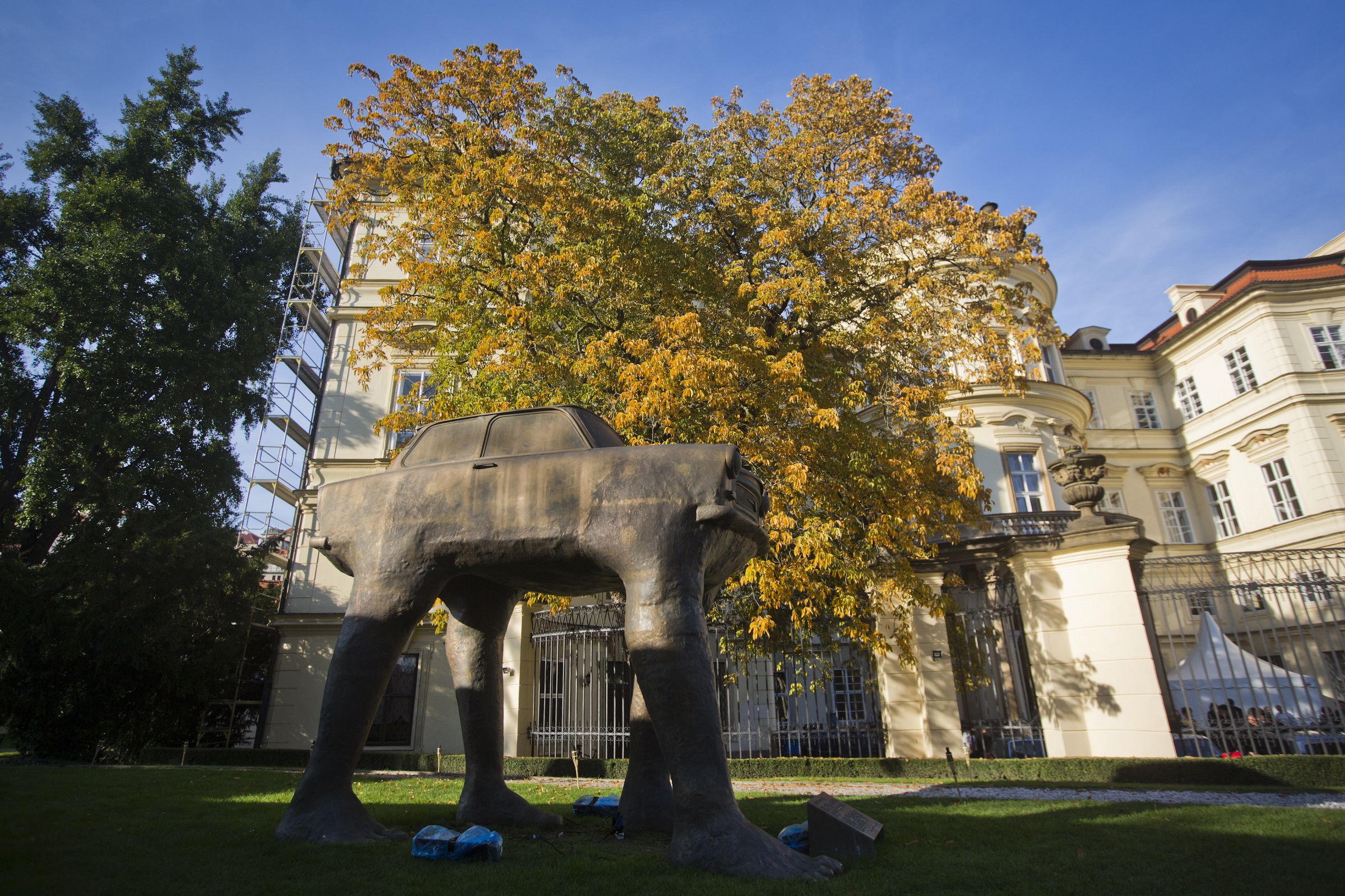 Az eredetileg fémből és üvegszálból készült, 310 cm magas alkotás neve magyarul azt jelenti, hová mész. Története mélyebb annál, mint amit a fura, rémálomba illő megjelenés sugall. Annak idején ugyanis Csehszlovákia, azon belül is Prága és a nyugatnémet nagykövetség nagy szerepet játszott abban, hogy az NDK-ból nyugatra vágyó emberek átjussanak az NSZK-ba. Sokan beültek a Trabantjukba, átautóztak a baráti szomszédhoz, ahonnan aztán sokan más módokon, autójukat hátrahagyva mentek nyugati irányba.