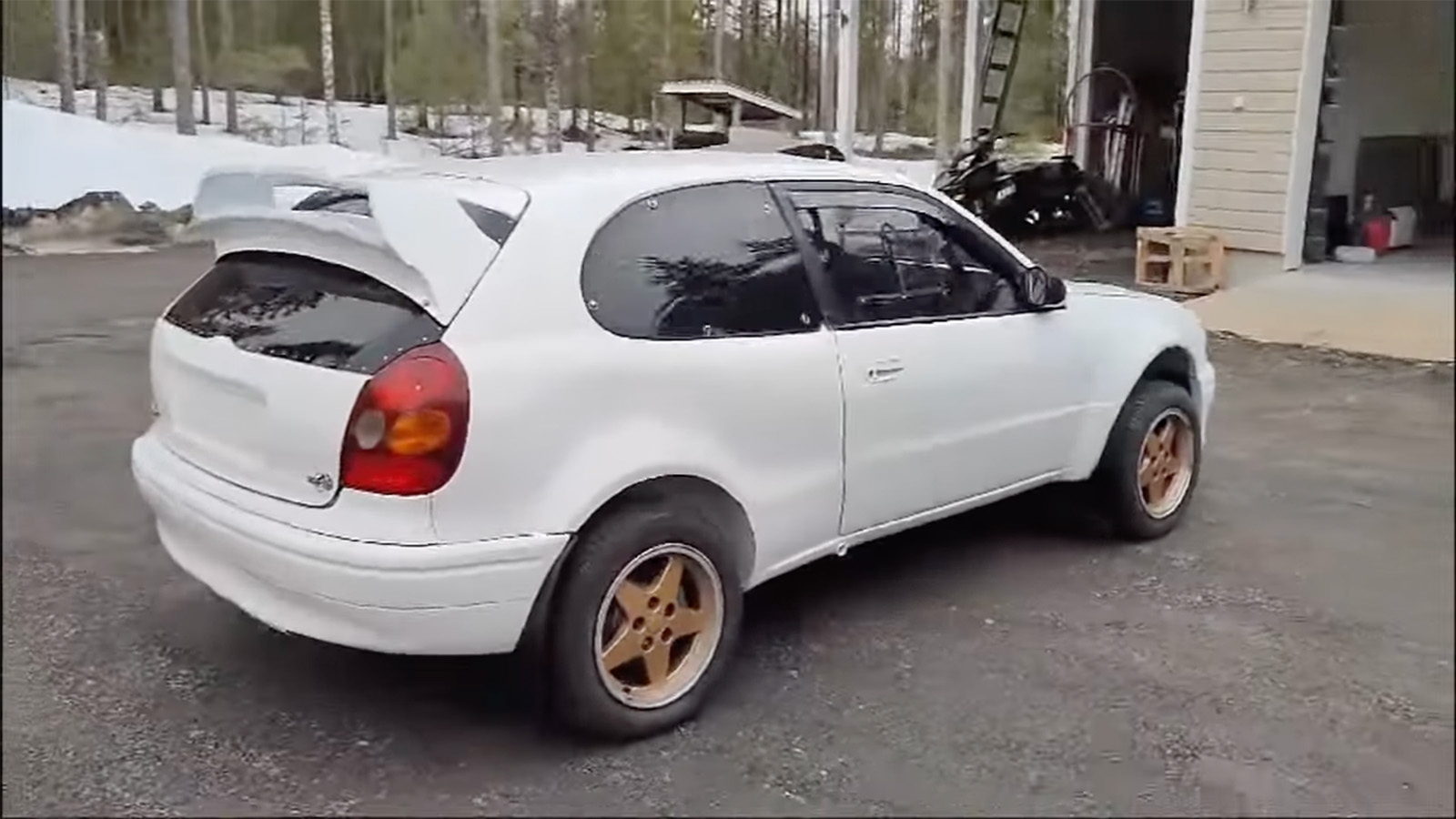 A projekt nem állt meg ott, hogy ezt a megvadított Yaris-motort bepréselték egy öreg Corolla ferdehátú kasztnijába; a hajtást átalakították úgy, hogy az a hátsó kerekeket tépje. Végül is, miért ne?