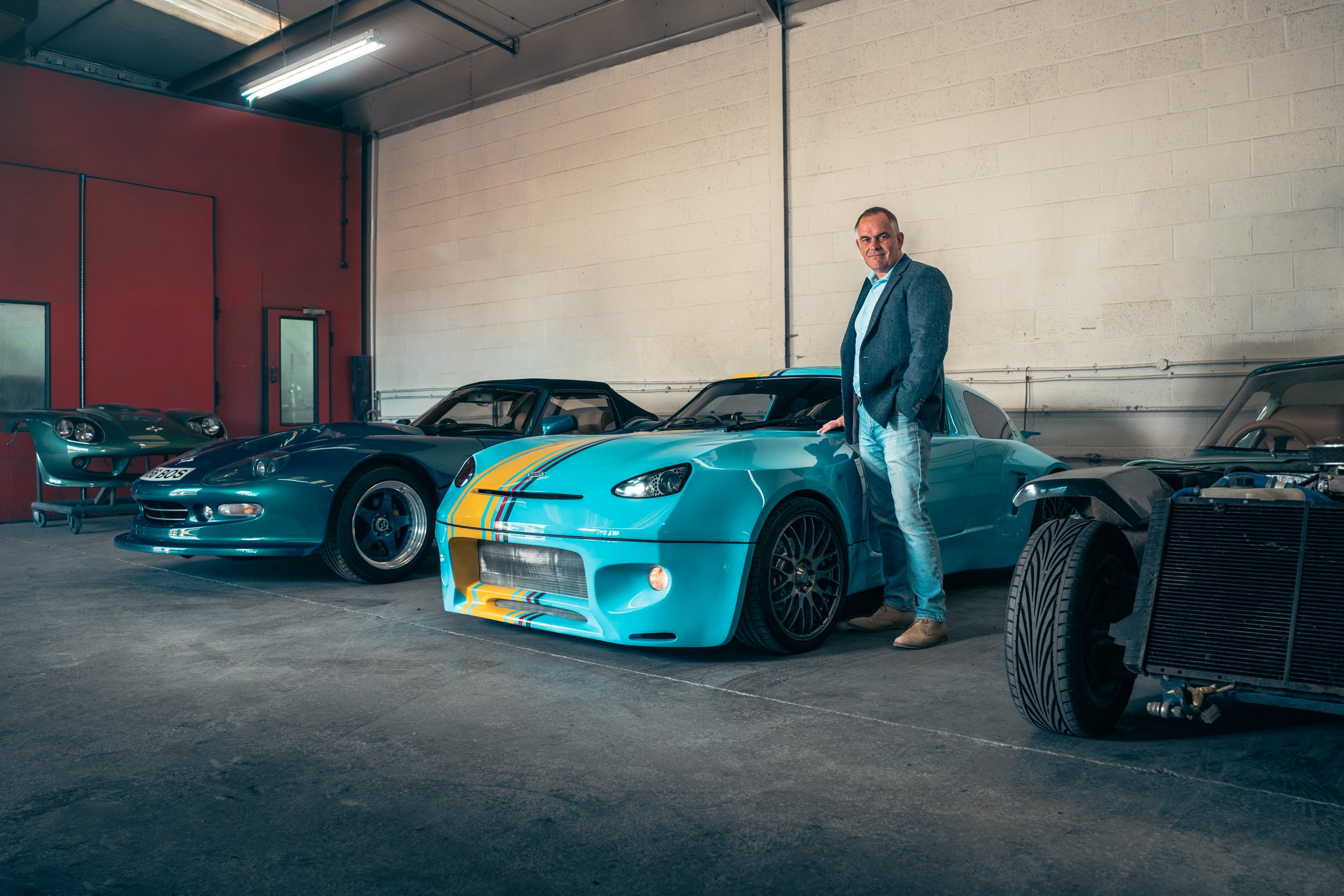 A képen Howard Nash, a Marcos Motor tulajdonosa, az előtérben vélhetően már a leendő közúti modell prototípusa látható, a háttérben egy Marcos Mantara