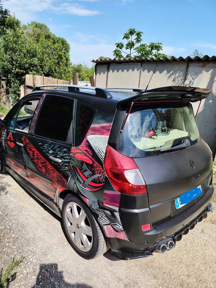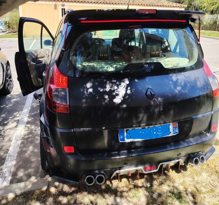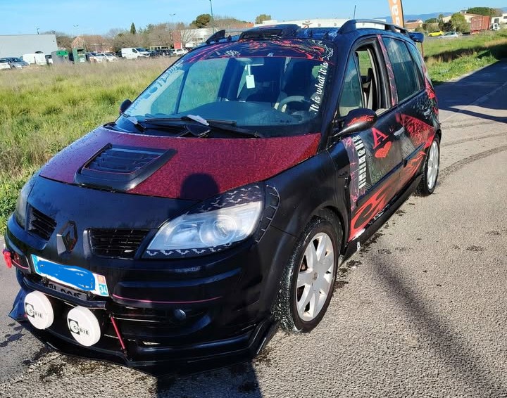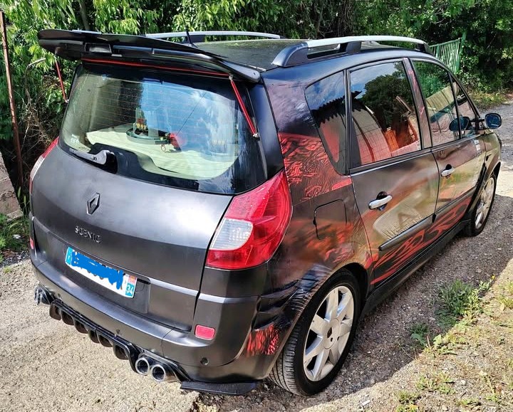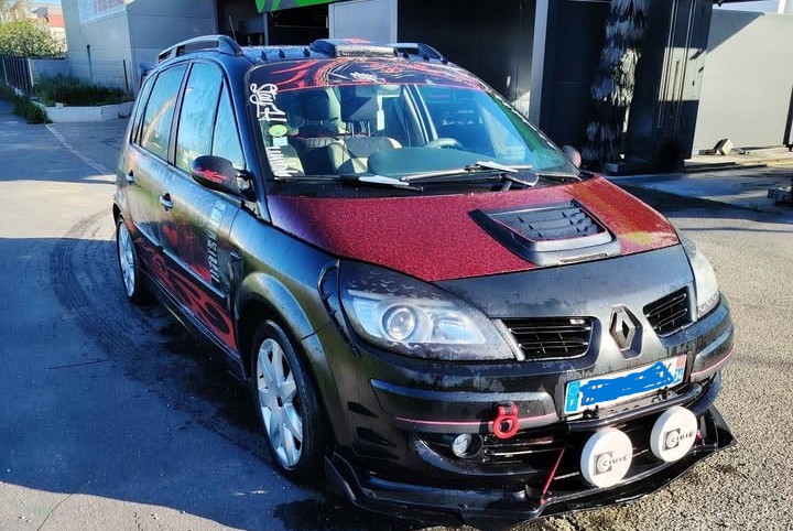 A második generációs Renault Scénic 2003-ban jelent meg, és az egyik legnépszerűbb kompakt egyterű volt Európában. Praktikus, tágas, variálható belsővel, rengeteg tárolóval és családbarát megoldással hódított. Nem a vezetési élményről szólt, hanem arról, hogy kényelmesen elfér benne minden és mindenki. Pont ezért különösen bizarr látni, amikor egy ilyen alapvetően nyugodt, családi autóból valaki ennyire harsány gépet farag.